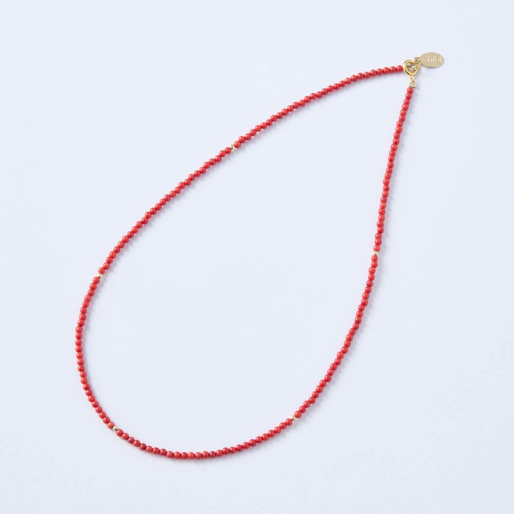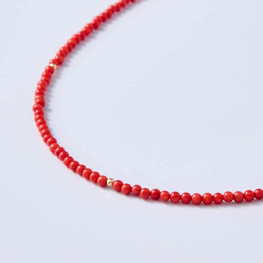 ・発色のいいサンゴとラピスラズリが、コーデの引き締めに貢献