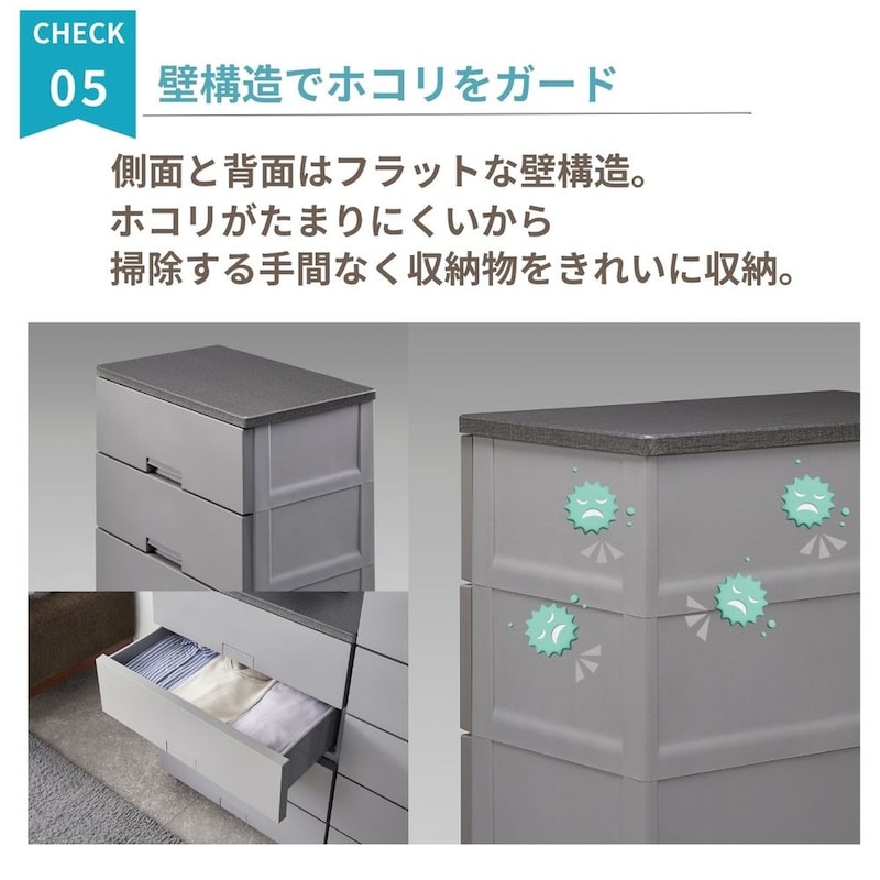 ●引出しが隙間なく閉まってホコリの侵入をガード。大切な衣類を清潔に保管できます。