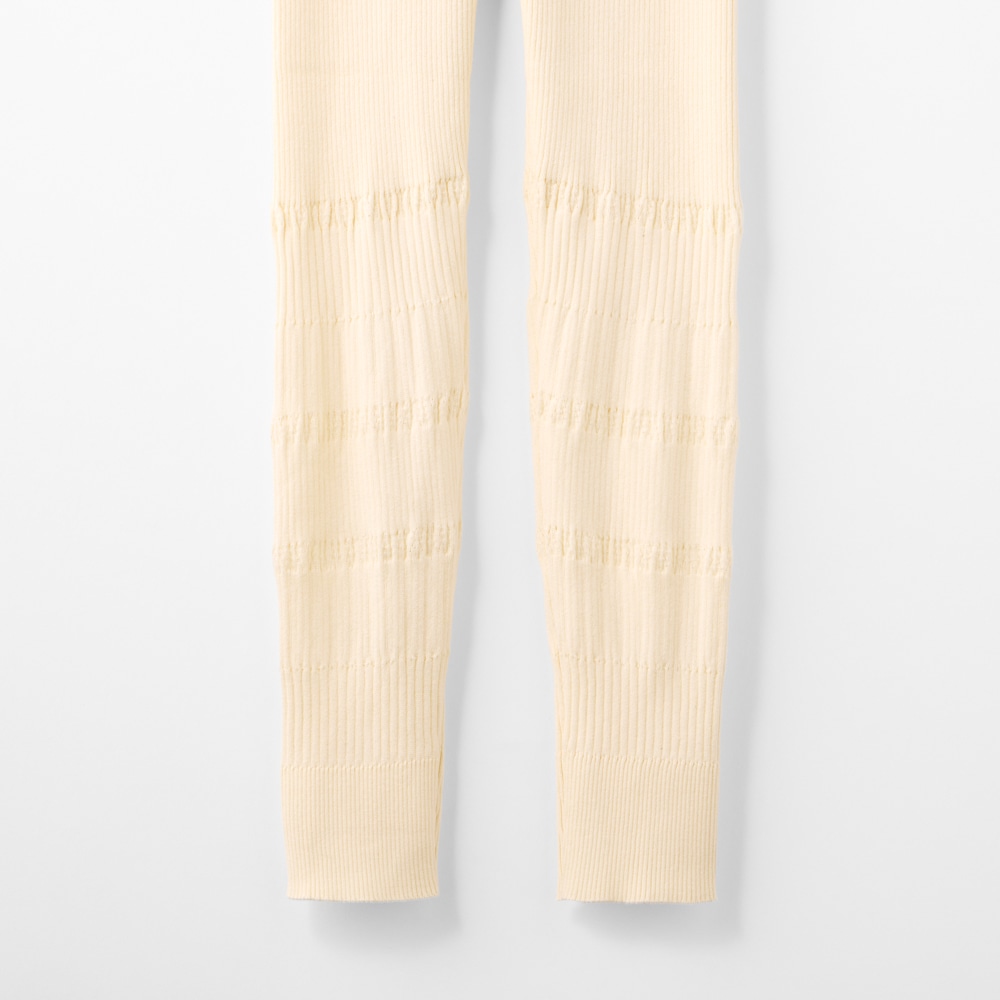 確かに柔らかくて着心地は良いのですが、なぜこんなにゆるゆるなのかと不思議に思います。洗濯したからでしょうか。丈は良いのですが、腿もふくらはぎも足首も緩くて、ヒダが寄ります。編み地で細かく穴が開いているラインが3箇所あるのですが、そこが特に横に膨らんで、非常にみっともないです。このような横ラインが入っていなければ全体的に多少緩くてももう少しマシだったのでは。写真はあくまでもイメージで、ピタッと体にフィットするのかと思いきや、全然違います。外ではとても履けませんね、完全に室内用です。