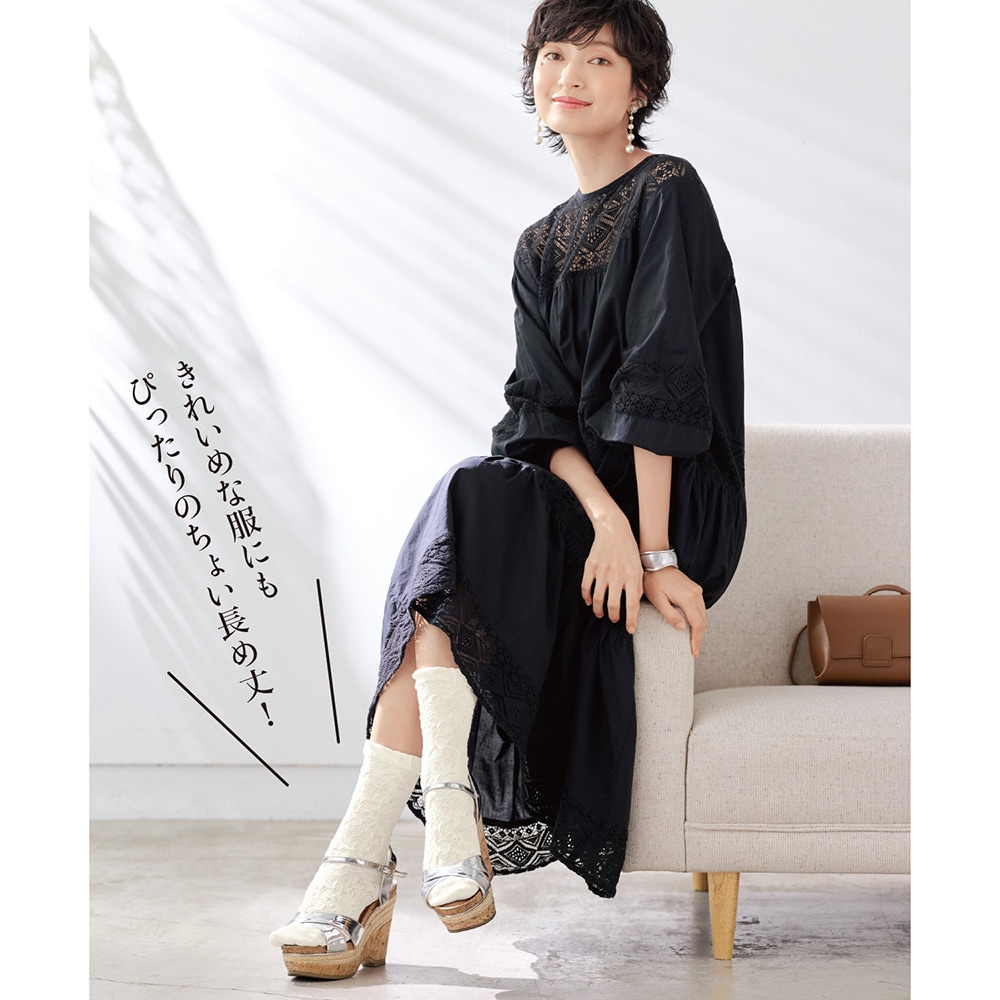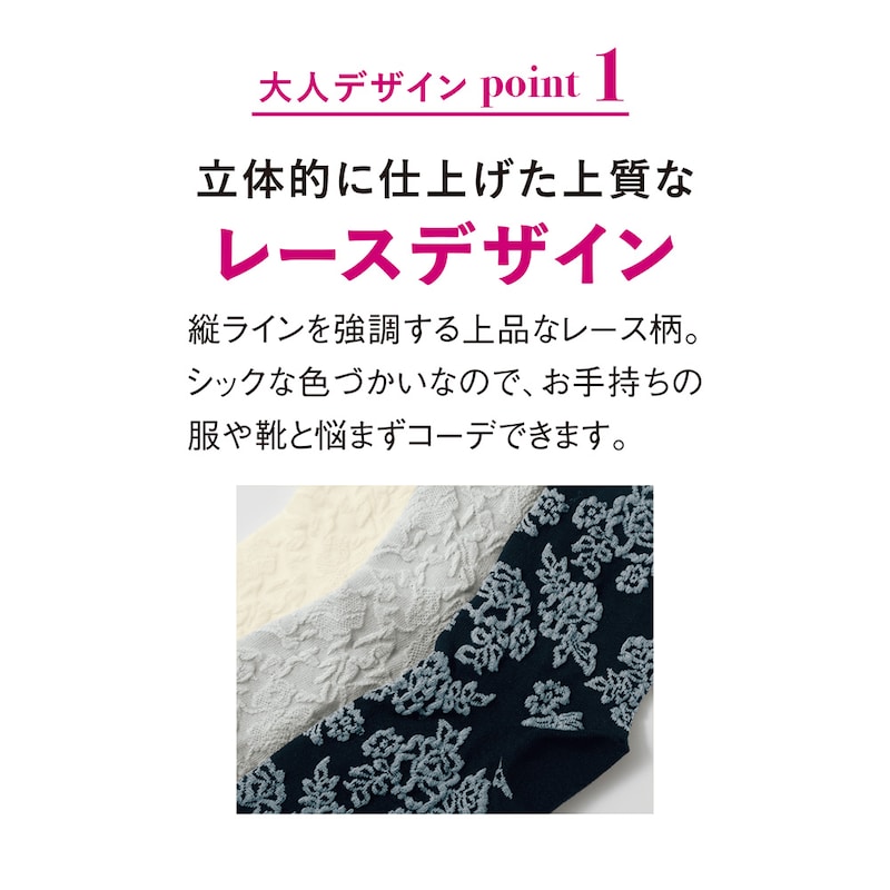 縦ラインを強調する上品なレース柄&シックな色づかいなので、お手持ちの服や靴と悩まずコーデできます。