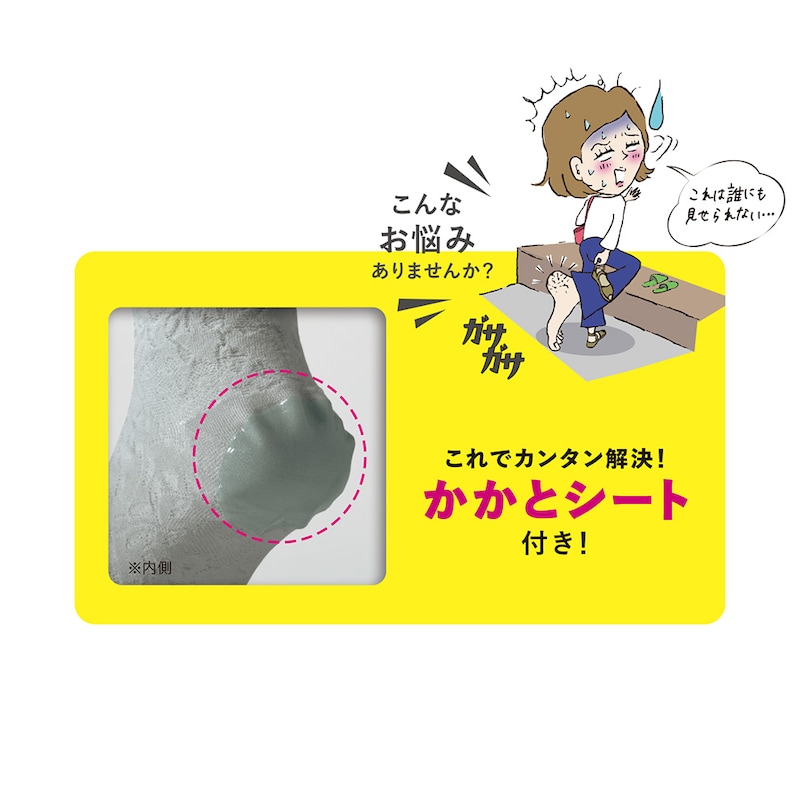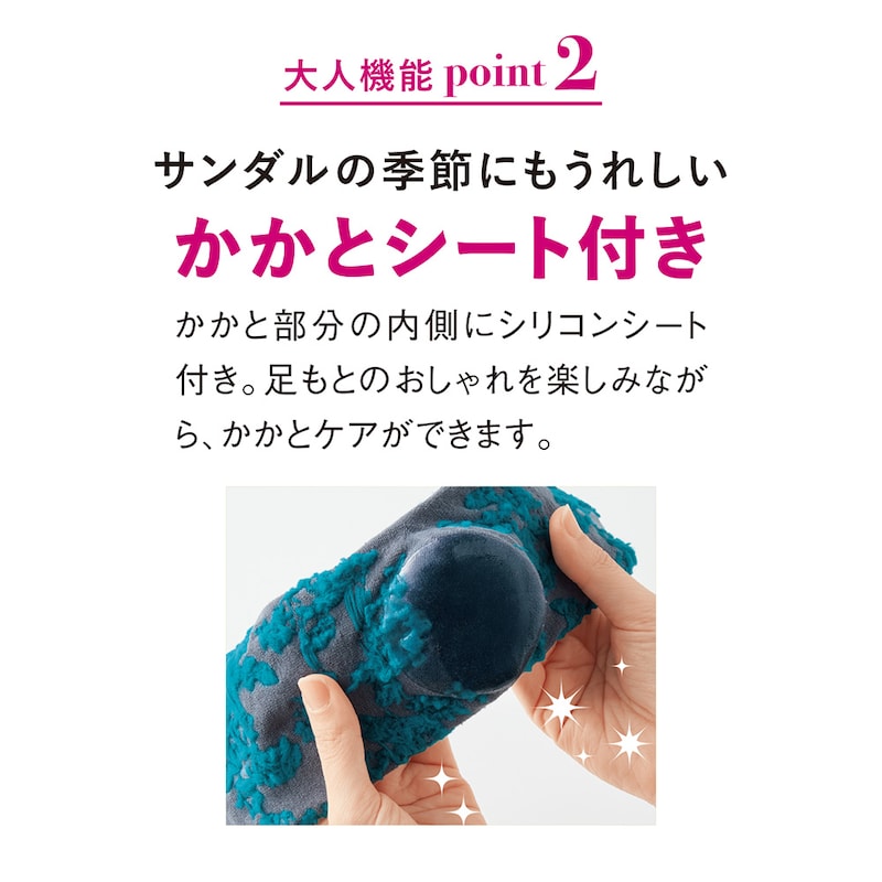 かかと部分の内側にシリコンシート付きなので、足もとのおしゃれを楽しみながらかかとケアができます。