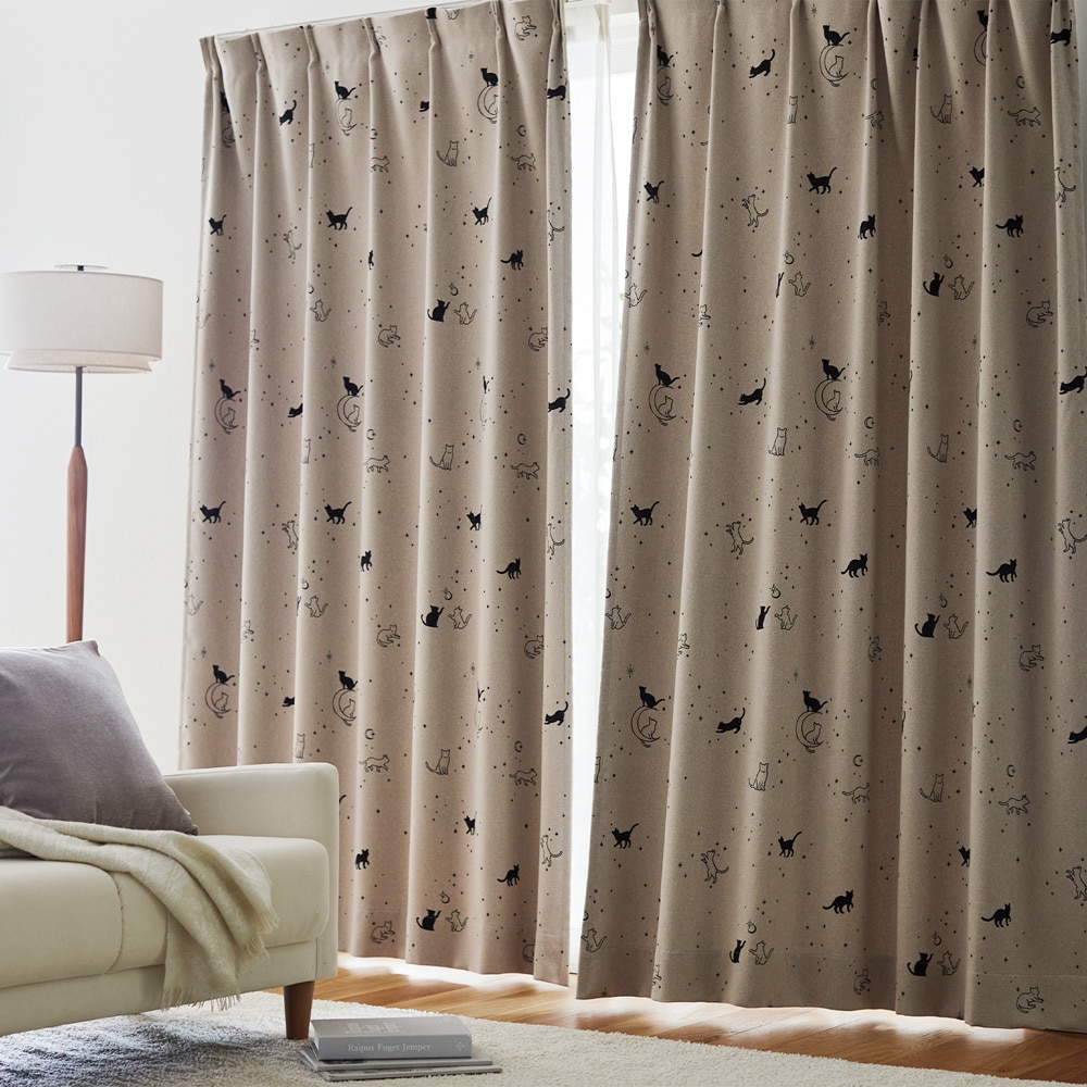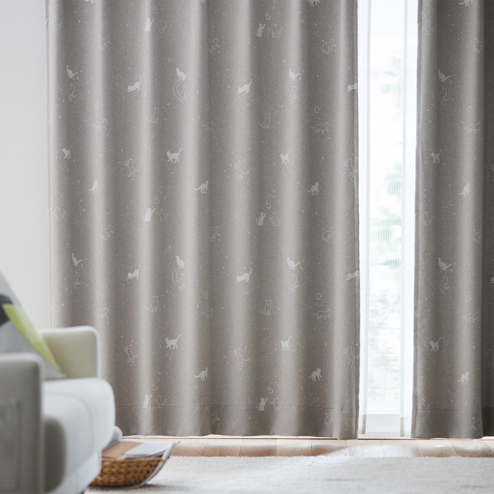 【99サイズ】 ネコ柄プリントの遮光カーテン <2枚組/1枚>