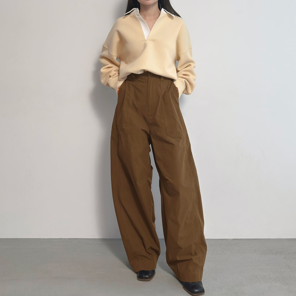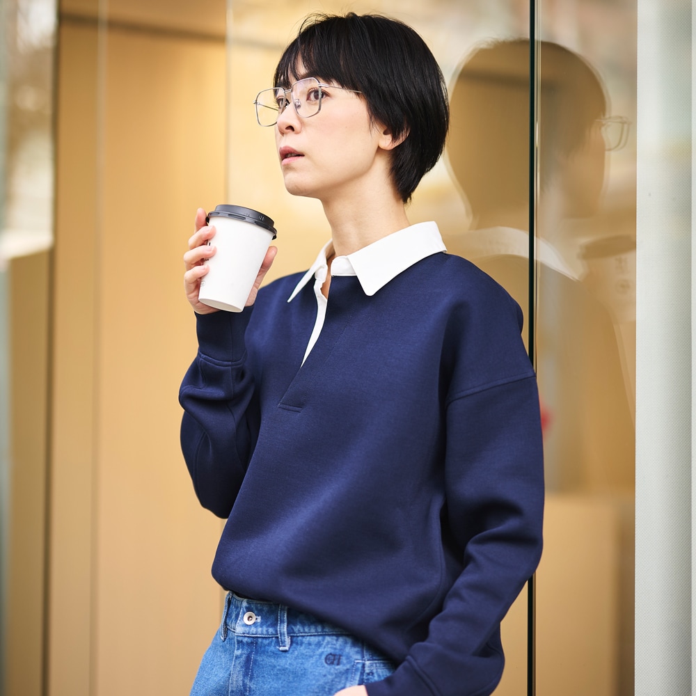 ・大きめの襟で、顔まわりをすっきり見せるデザイン