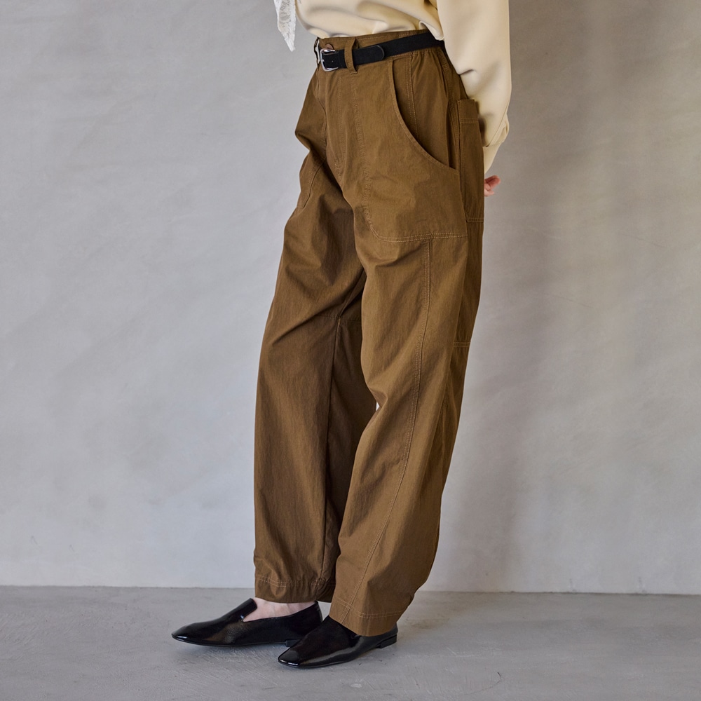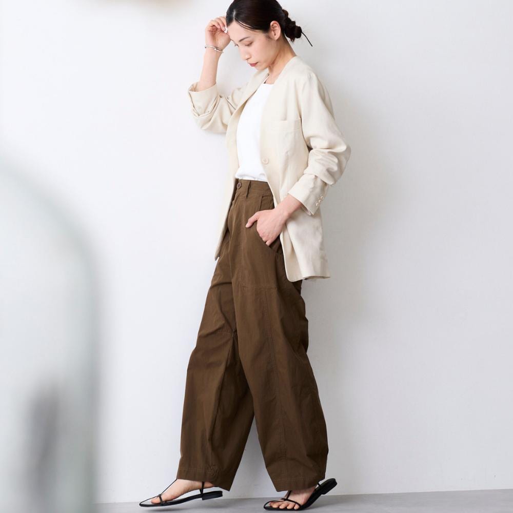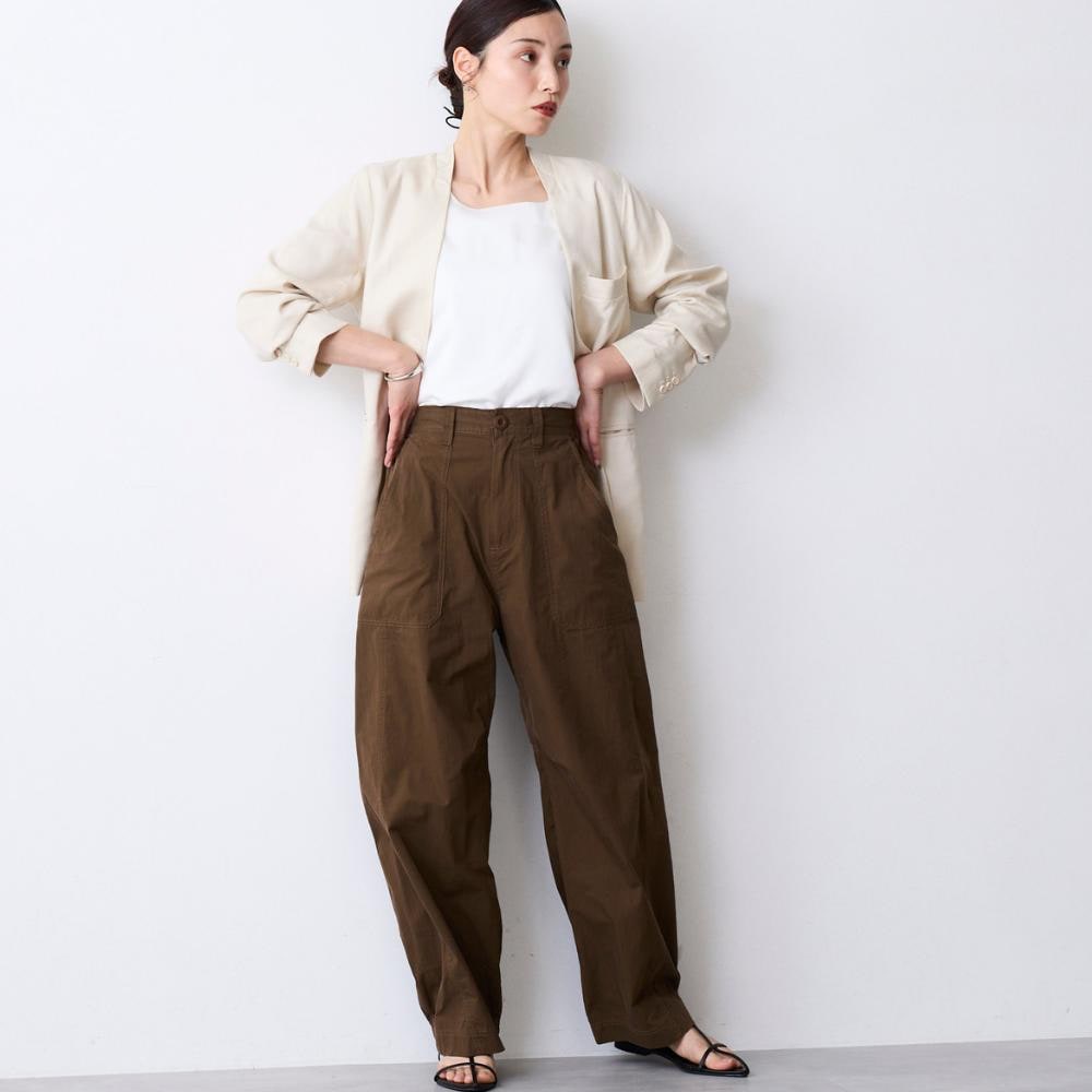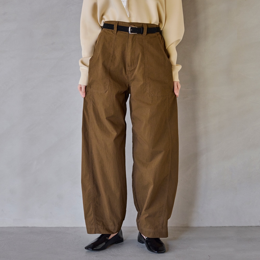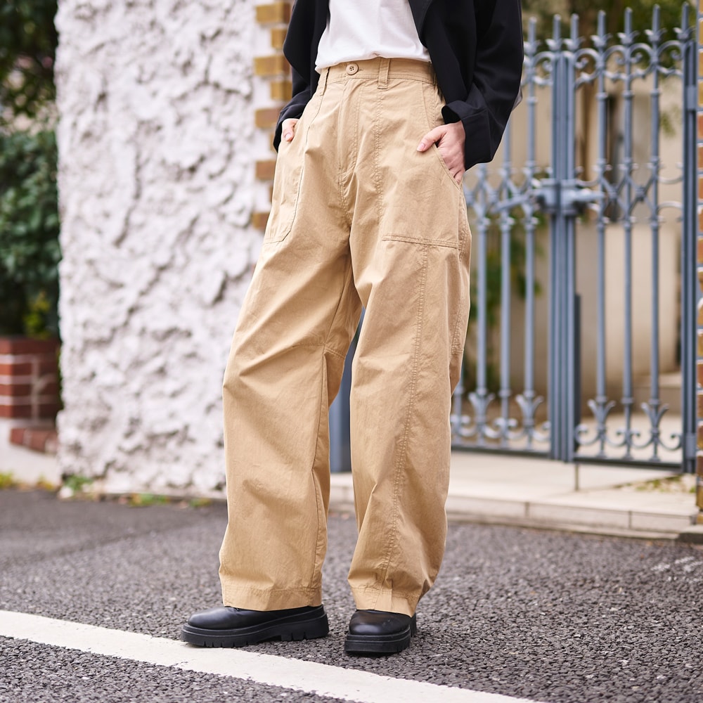 ・裾にカーブをつけたバレルシルエットのカーゴパンツ。立体的なフォルムで、今っぽいボリューム感を演出