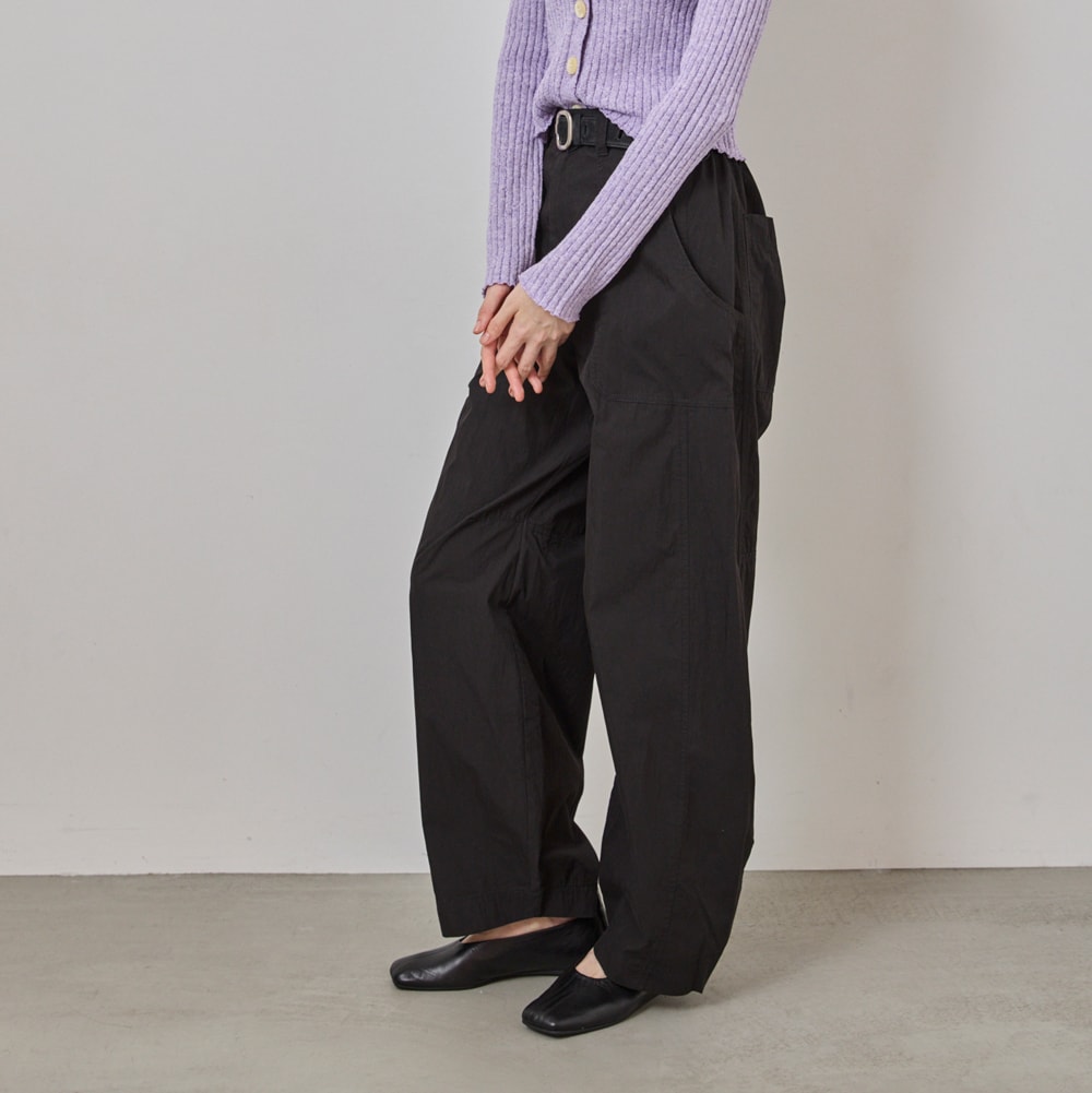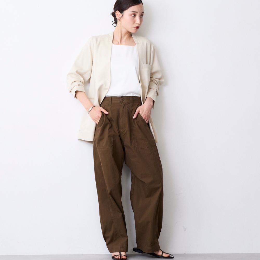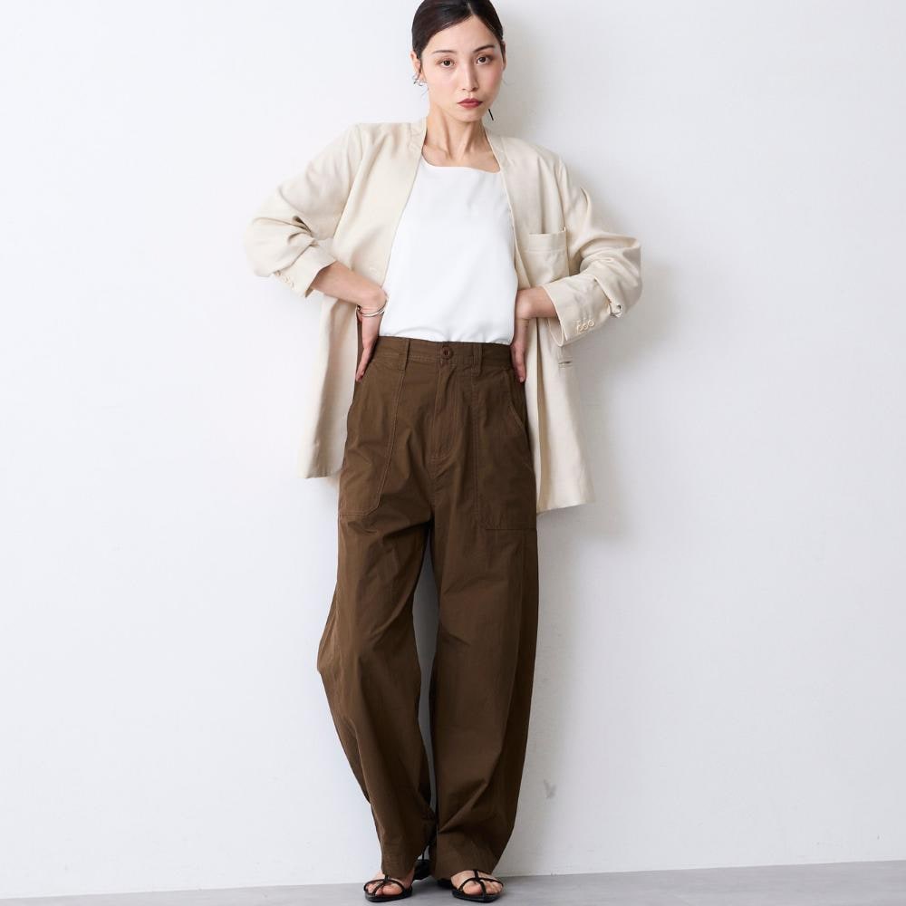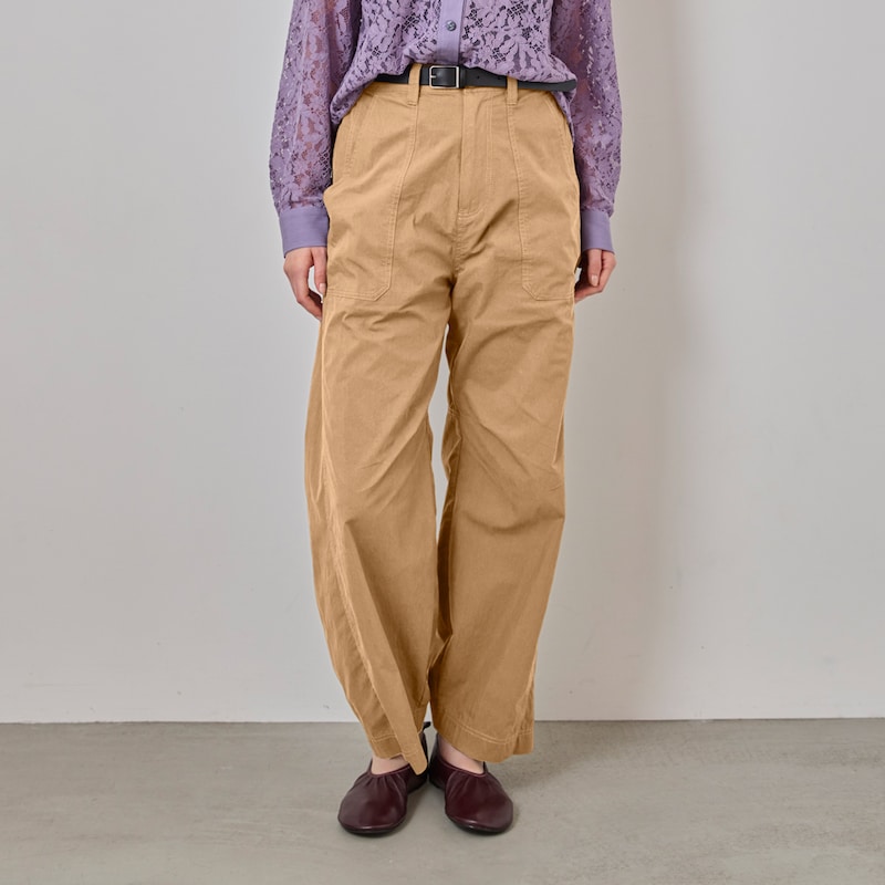 ・裾にカーブをつけたバレルシルエットのカーゴパンツ。立体的なフォルムで、今っぽいボリューム感を演出