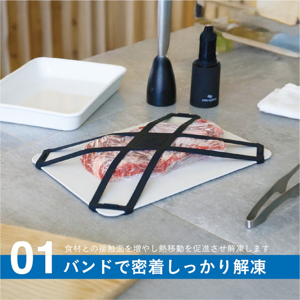 • 専用バンドで、冷凍された食材をプレートにしっかりと密着固定、食材と解凍プレートの接触面を増やします