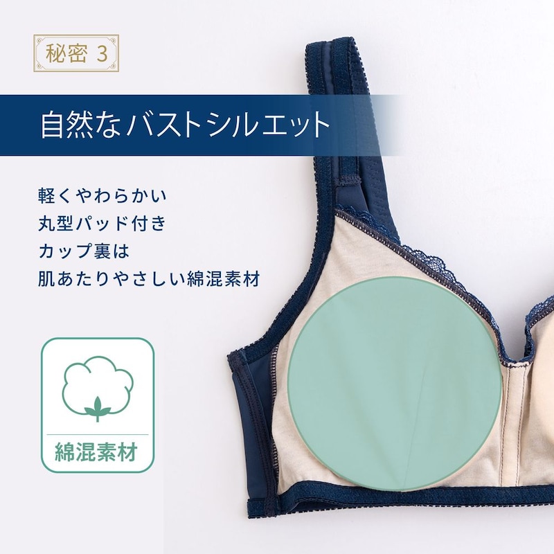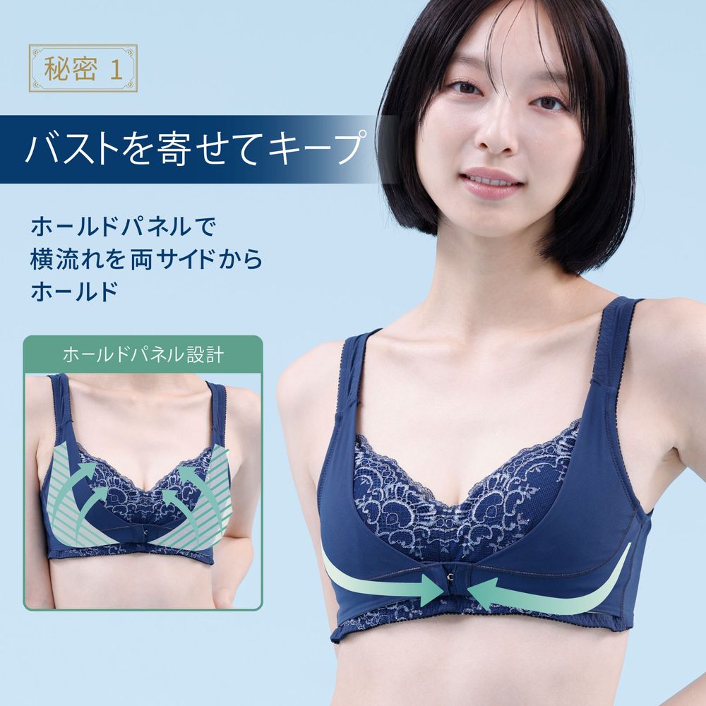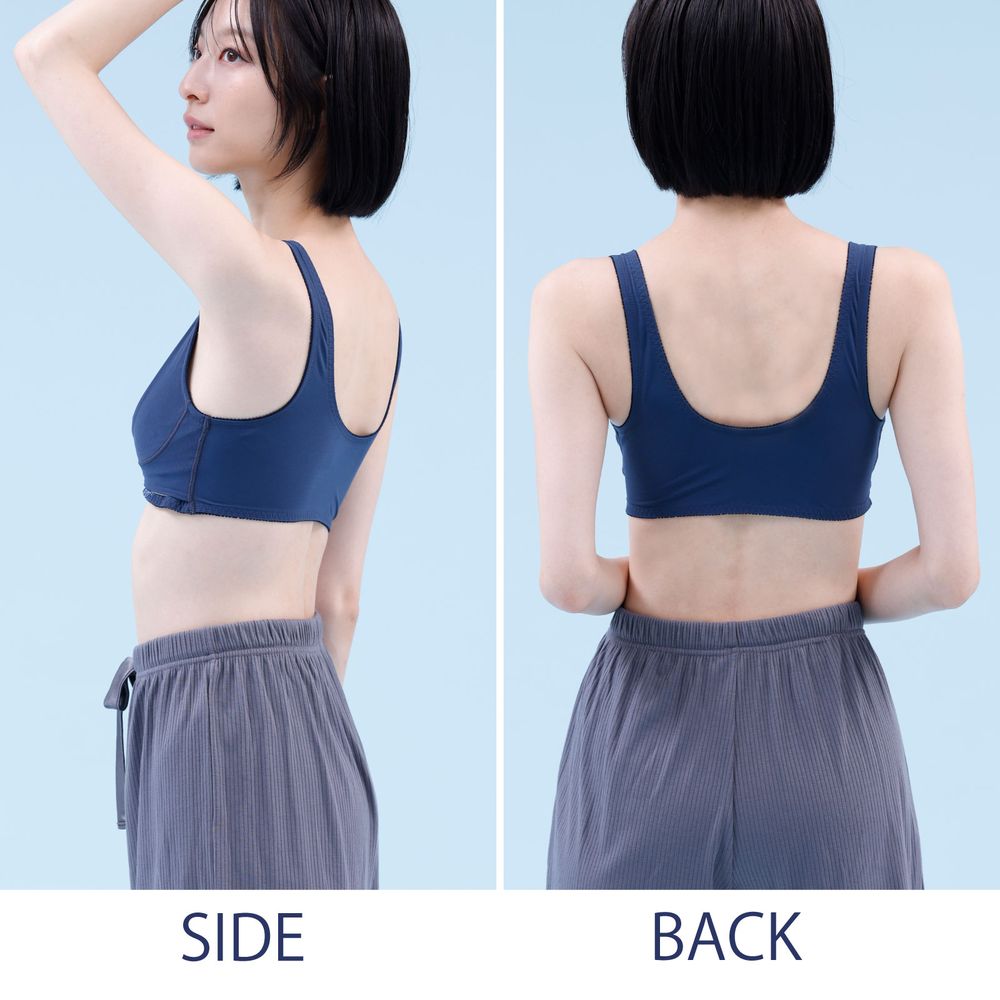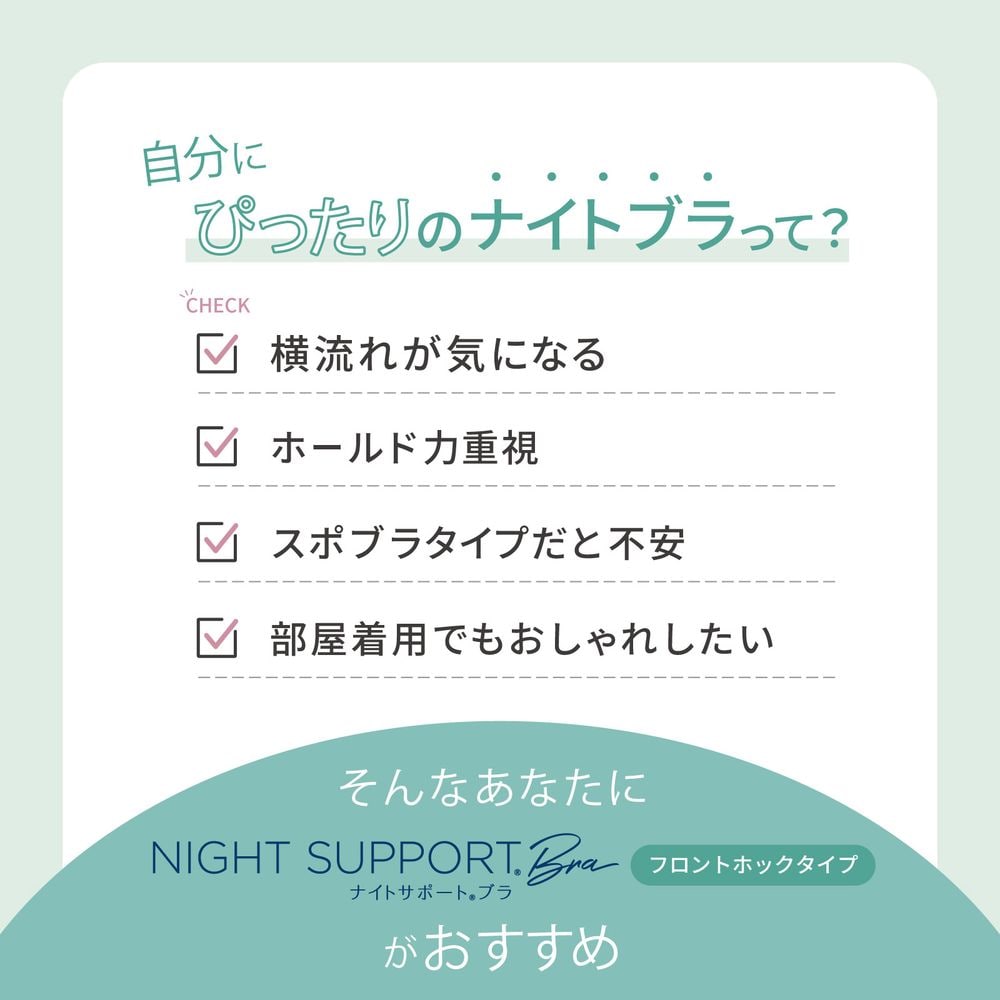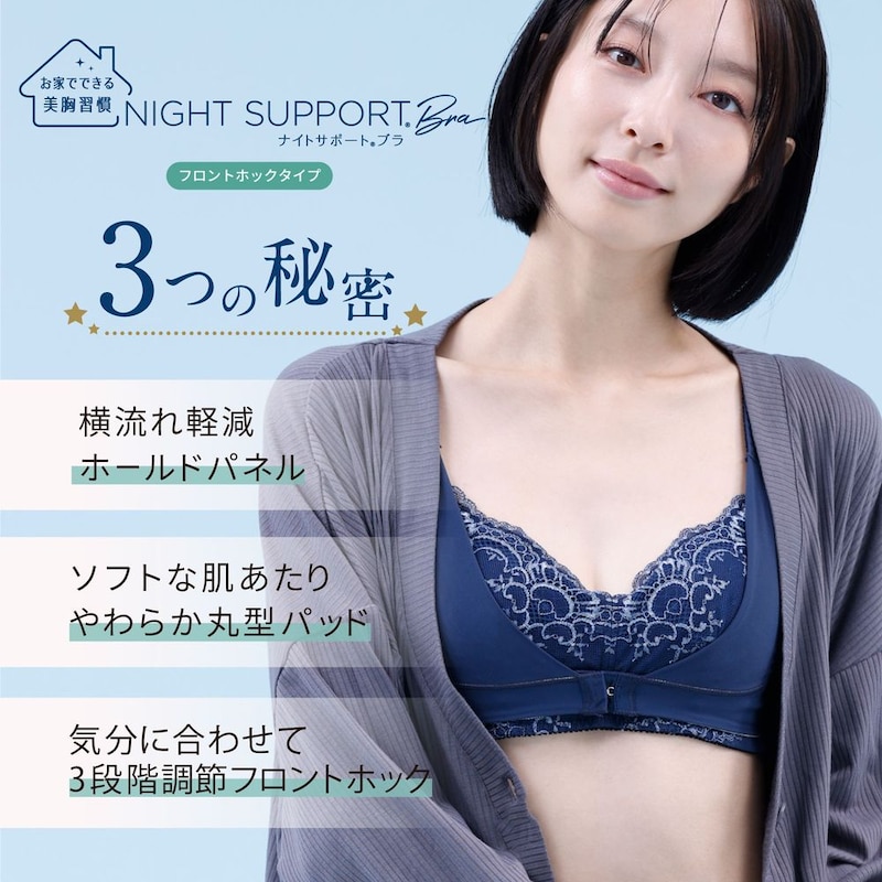 フロントホックタイプのナイトサポートブラは、サイドのホールドパネルで脇胸を寄せ、睡眠中のバストをしっかりキープしてくれます。