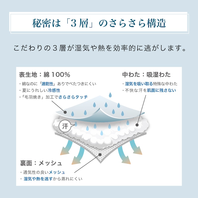 ●表地に肌離れのいいドライなコットン生地を使用し、汗ばむ季節におすすめ