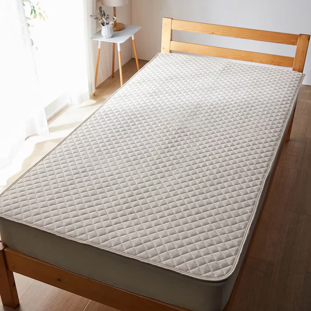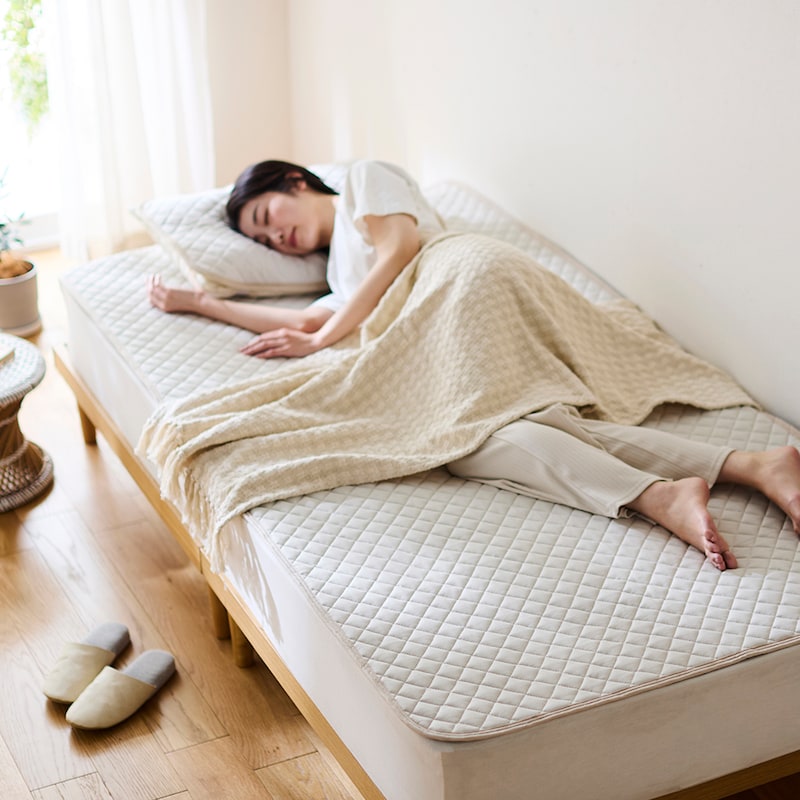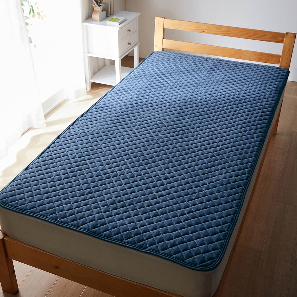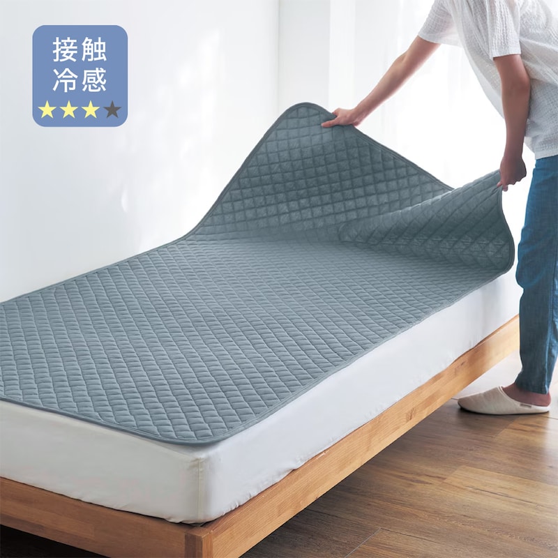 接触冷感がよくわかりません。先染めの綿素材の置くだけ敷きパットも同時に購入しましたが、同じような色にしてしまったため、本当にどちらがどちらかわからないです。綿なので限界があるのかな?綿は帯電しないので寝具に最適です。もっと素材を見直し、綿製品が増えるといいと思います。綿の敷きパットはなかなか他店では見かけないし、何と言っても置くだけが楽らくちんです。ほとんどずれないので助かります。絶対4隅ゴムよりいいです。