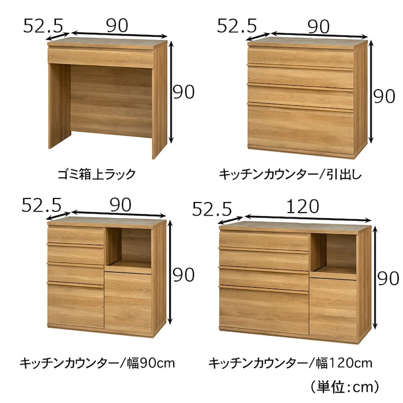 ■ゴミ箱上ラック・キッチンカウンター引出し・キッチンカウンター幅90cm/幅90、奥行52.5、高さ90cm