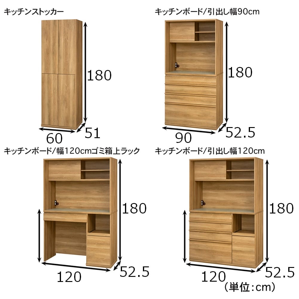 ■キッチンボード幅120cmゴミ箱上ラック・キッチンボード引出し幅120cm/幅120、奥行52.5、高さ180cm