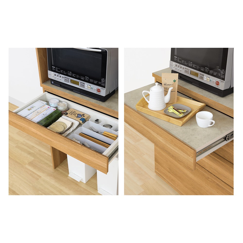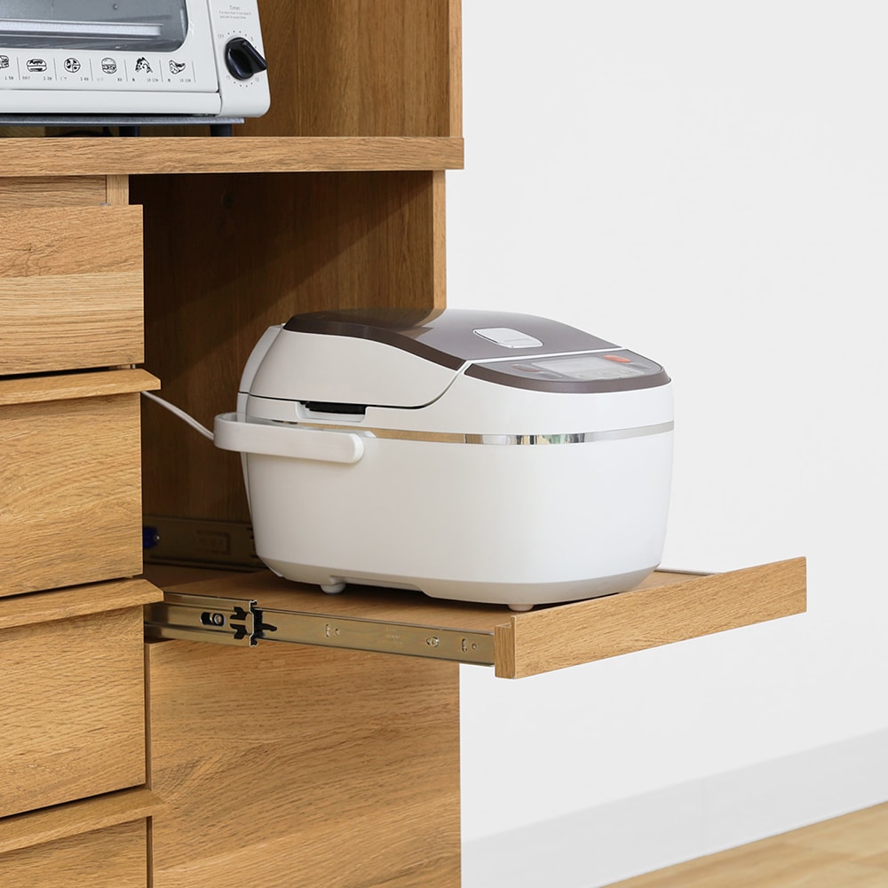 • 炊飯器やケトルなどが引き出して使えるスライド棚付き