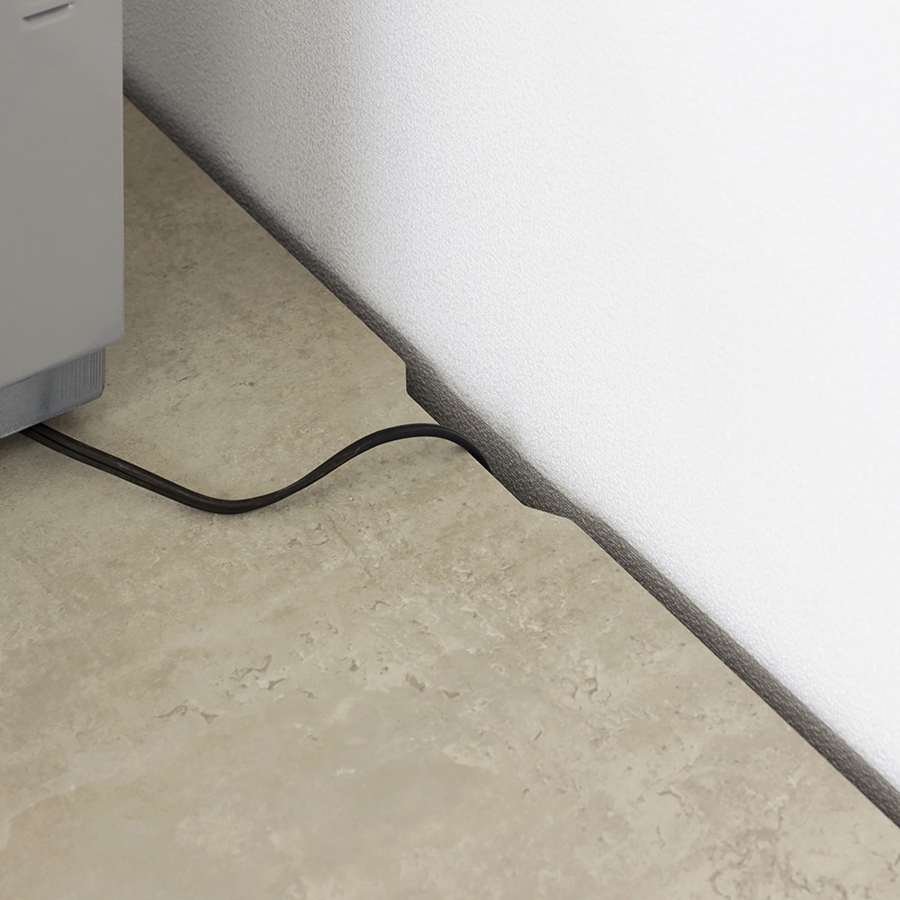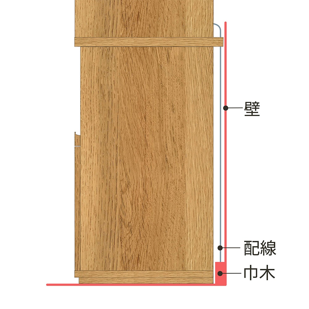 ●天板が背板より少し前に出ている設計により配線スペースを確保。また、巾木があっても壁にピッタリ設置できます