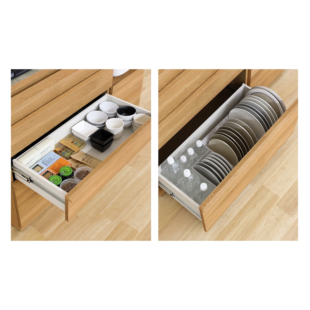 • 上から2、3段目の引出しは調味料などに便利な内寸工9.5cm、下段は2Lのペットボトルが入る33cm