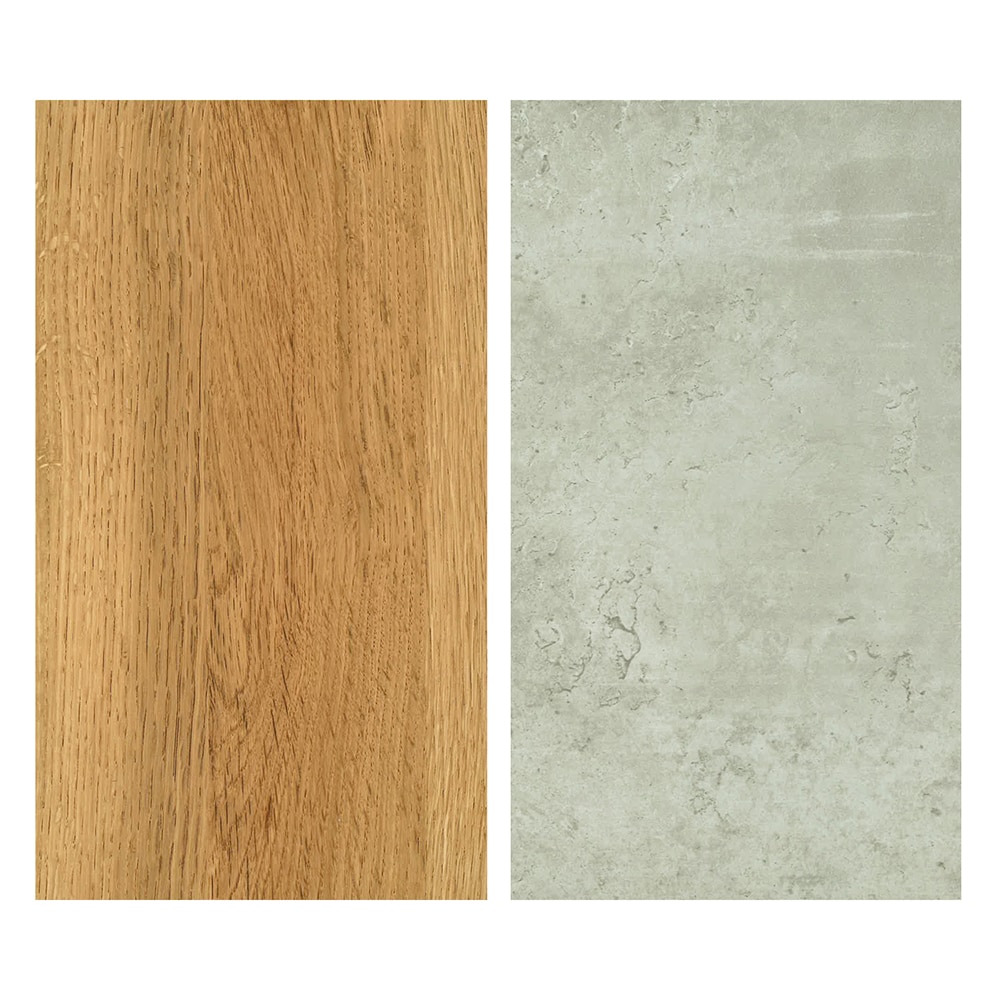 ●メラミン素材の大理石調グレー天板とオーク材パターンのシートの組み合わせがおしゃれ