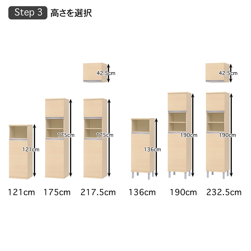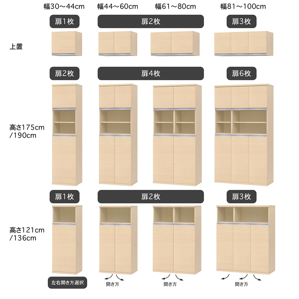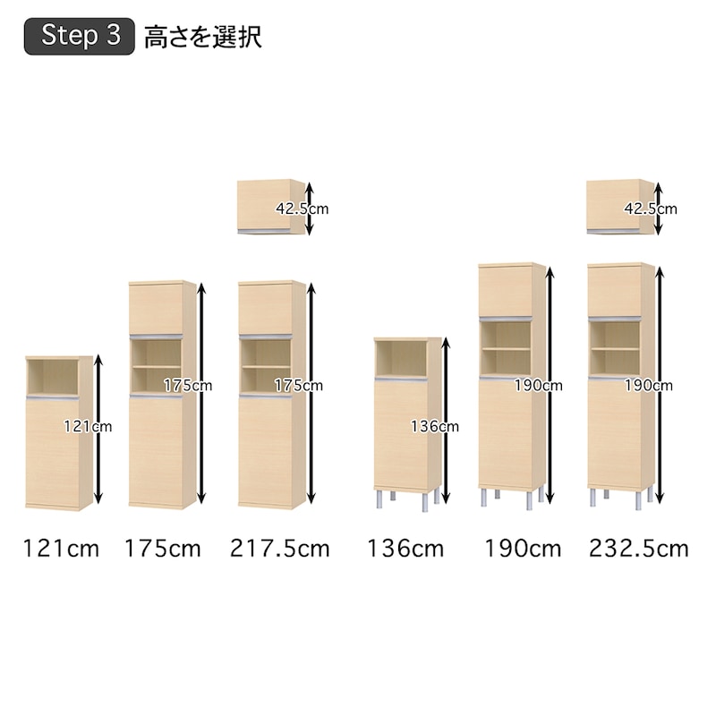 ●本体高さは120cm~上置き付き217.5cm、脚なしと脚付きが選べます