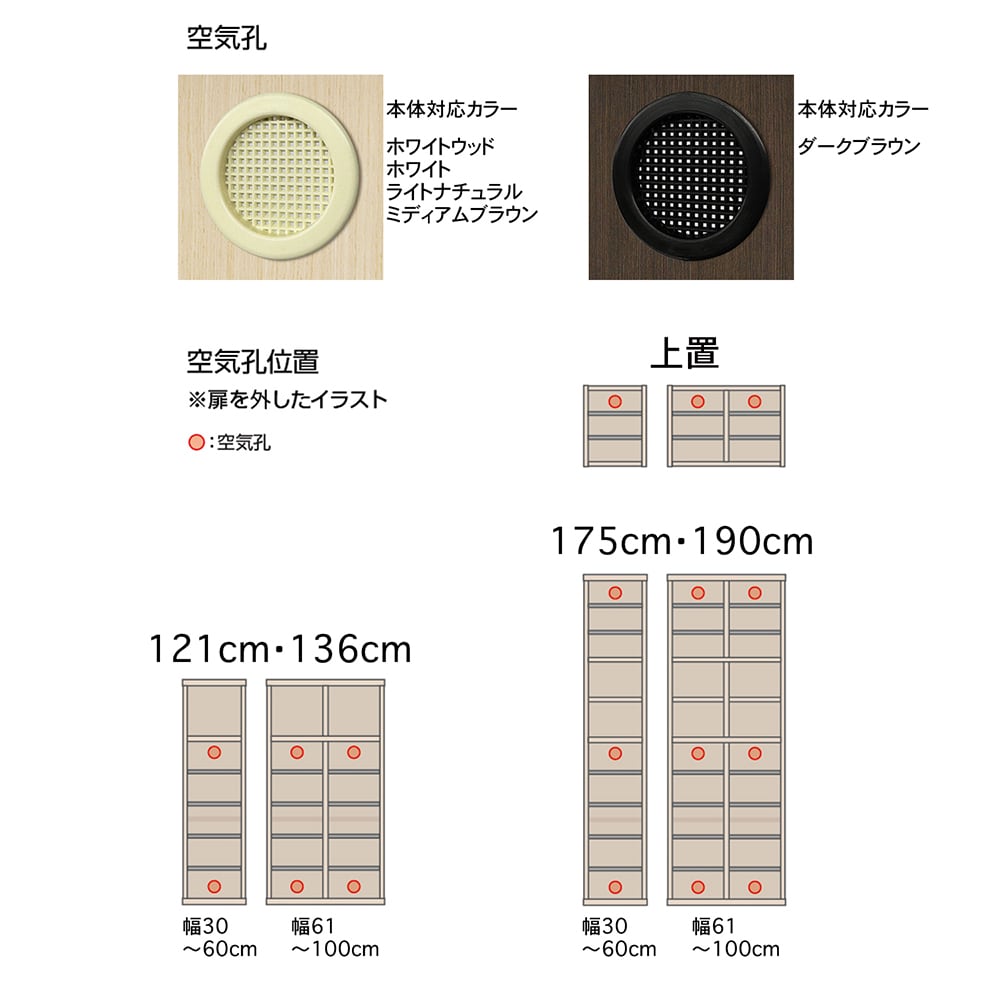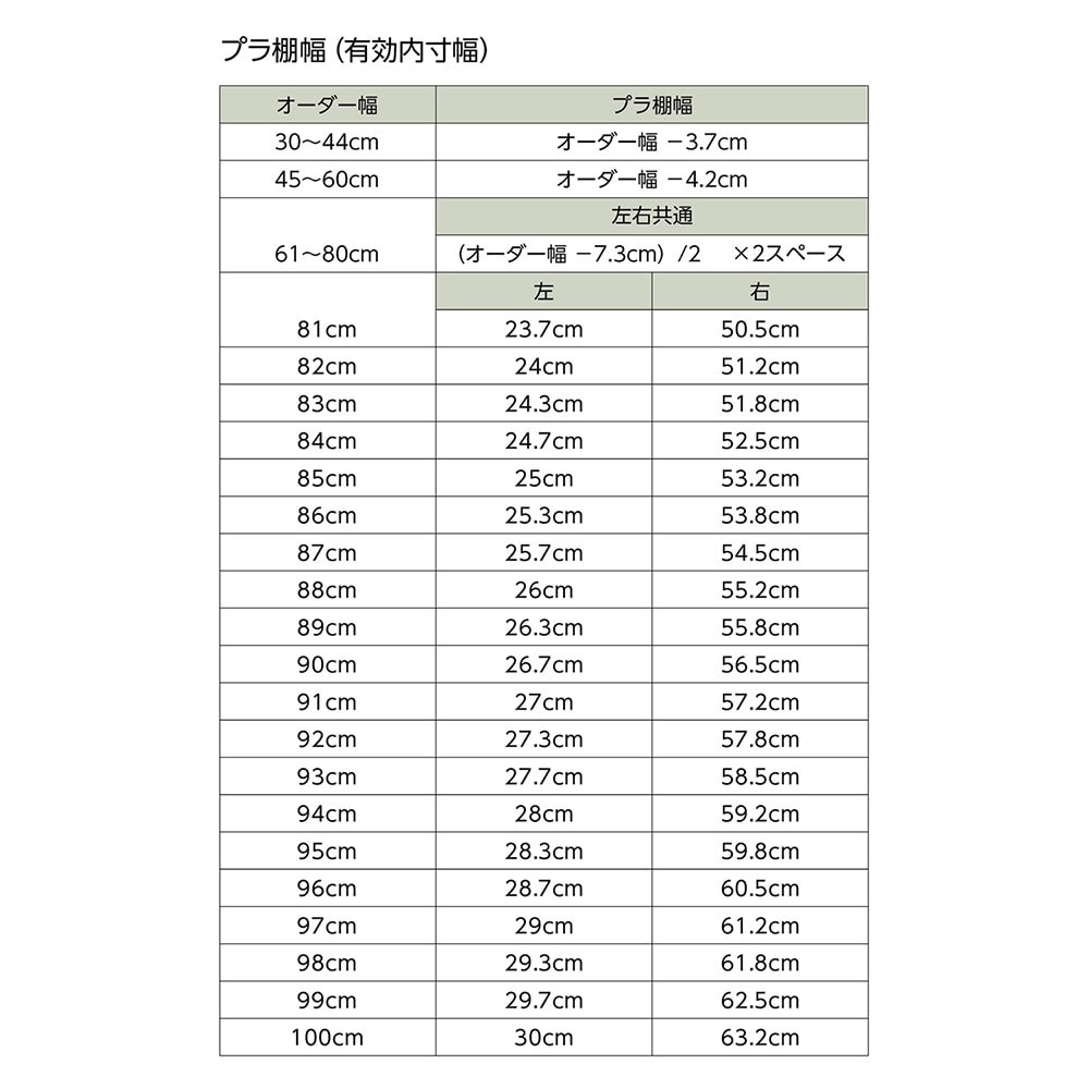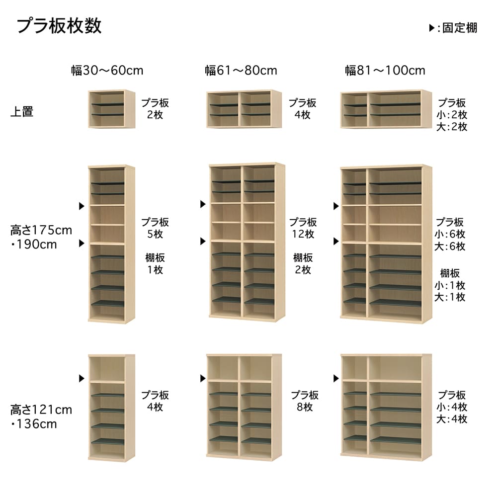 幅61~100cm(高さ121・136cm:プラ棚8枚、高さ175・190cm:棚板2枚・プラ棚12枚、高さ217.5・232.5cm:棚板2枚・プラ棚16枚)