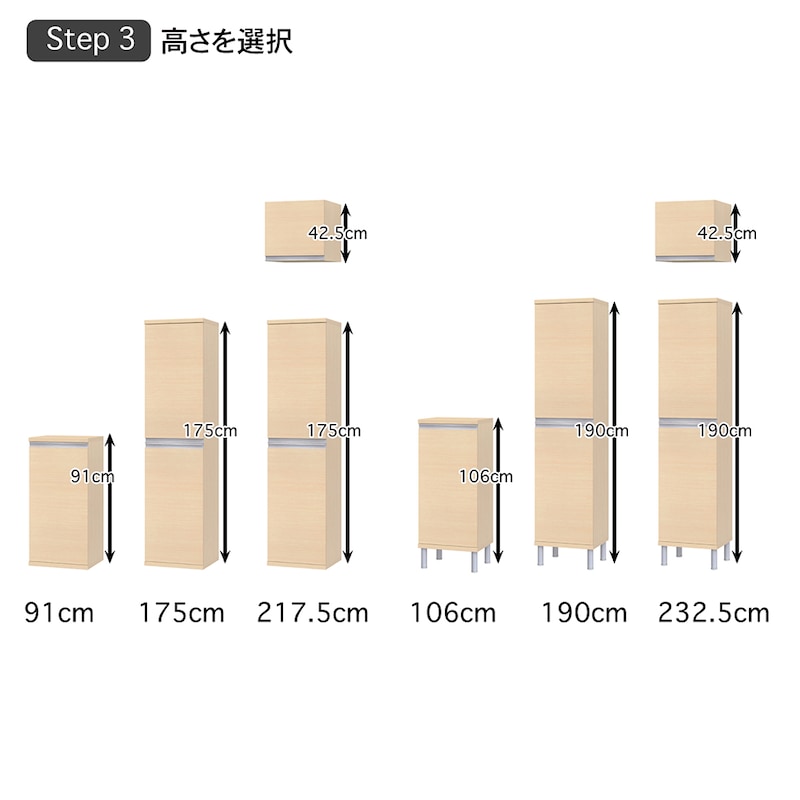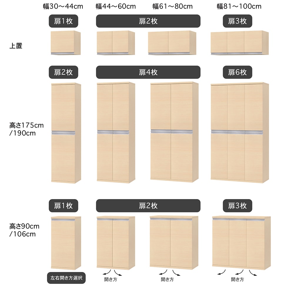 ●本体高さは90cm~上置き付き217.5cmまで、脚なし、脚付きから選べます