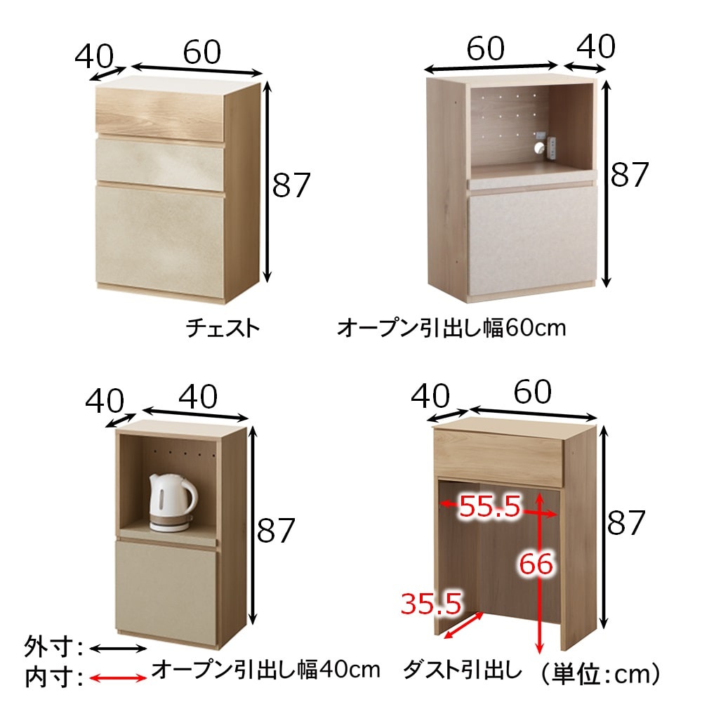 ■チェスト,オープン引出し幅40cm,オープン引出し幅60cm,ダスト引出し,天板・幅1160cm,天板・幅180cm/¥2,490(税込)
