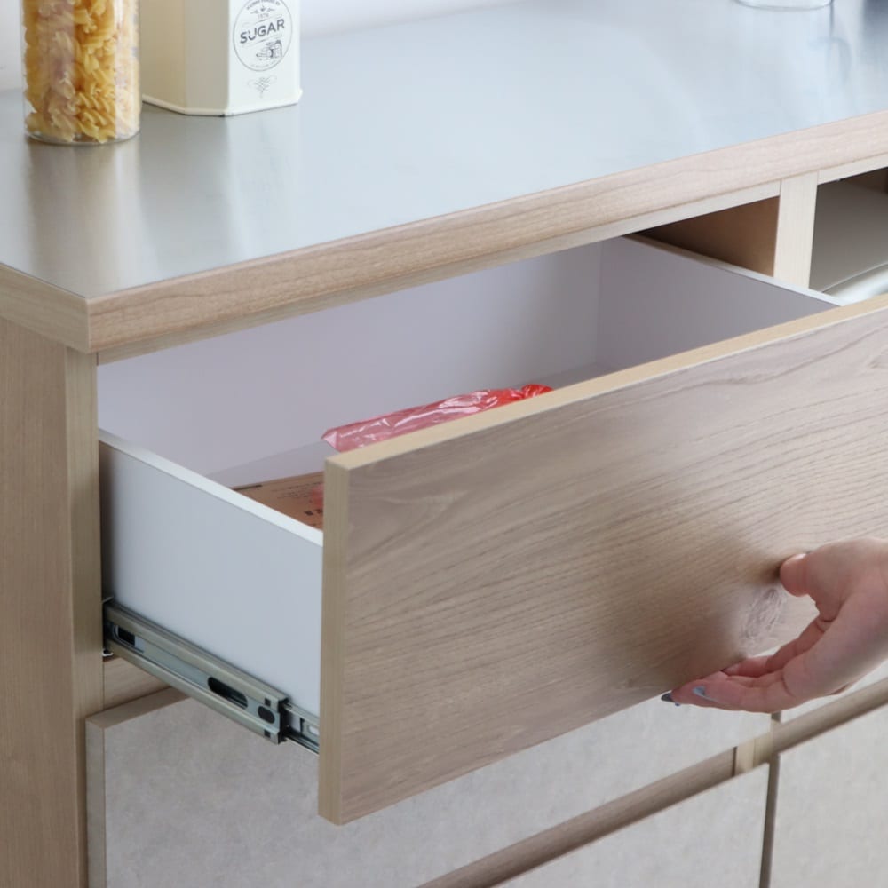 ●引出しは全段フルスライドレールで奥のものも取り出しやすい