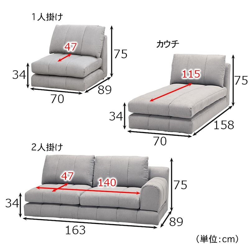 ●製品重量/1人掛け:33kg、カウチ:38kg、2人掛け:40kg
