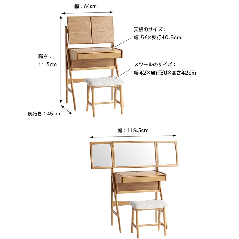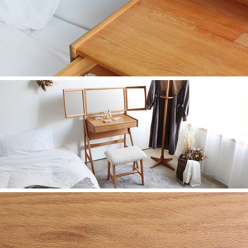 ●主材/ドレッサー本体:天然木(オーク材<ラッカー塗装>)、天然木化粧繊維板(オーク材<ラッカー塗装>)、脚部:天然木(オーク材<ラッカー塗装>)、ミラー部:天然木(オーク材<ラッカー塗装>)、天然木化粧繊維板(オーク材<ラッカー塗装>)、ミラー:3mm厚ミラー、スツール:座面張地:ポリエステル、座面中身:ウレタンフォーム、脚部:天然木(ラバーウッド材<ラッカー塗装>)
