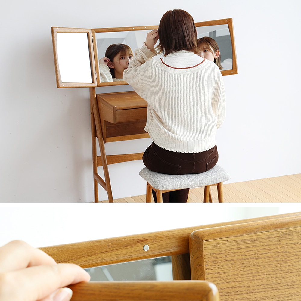 天然木の3面鏡ドレッサー&スツール 【コンセント付き】<ボトルが収納できる>