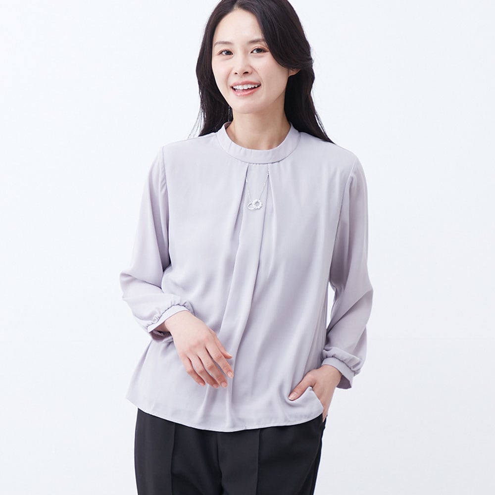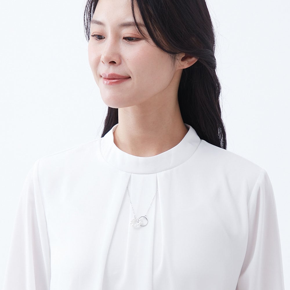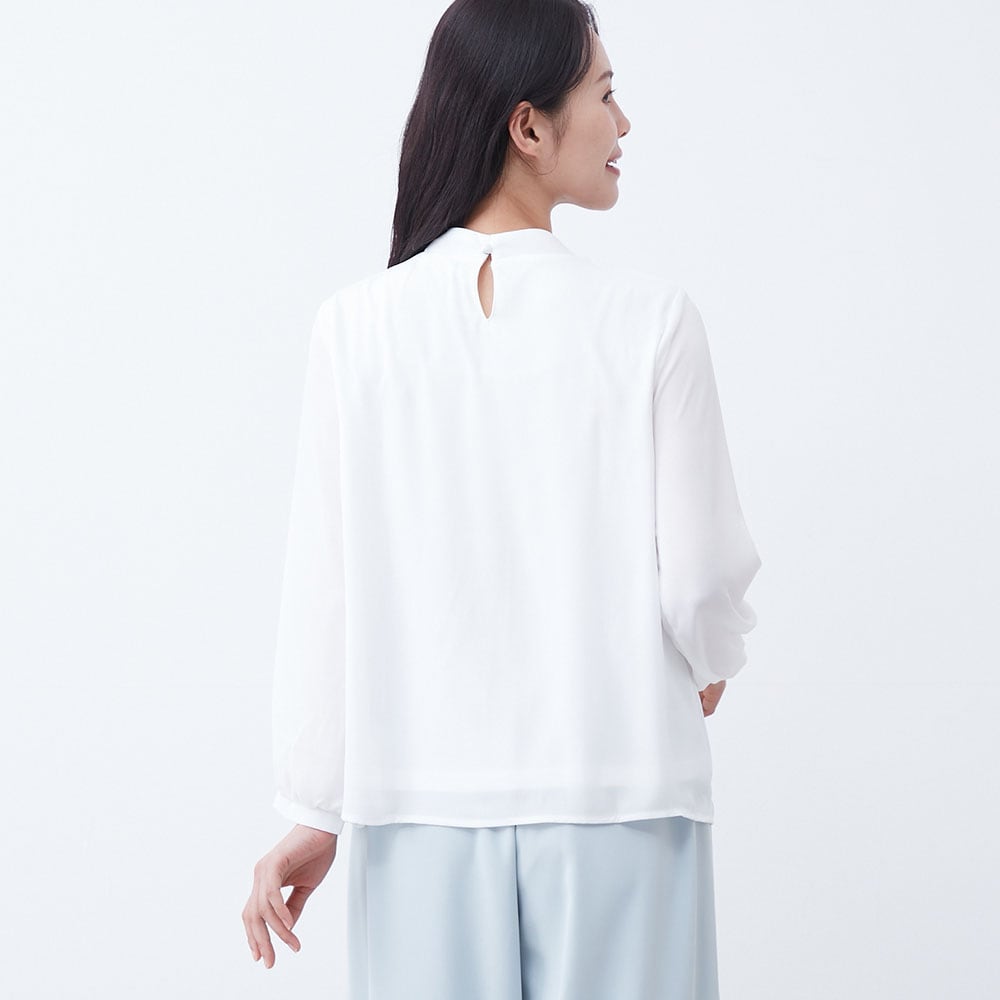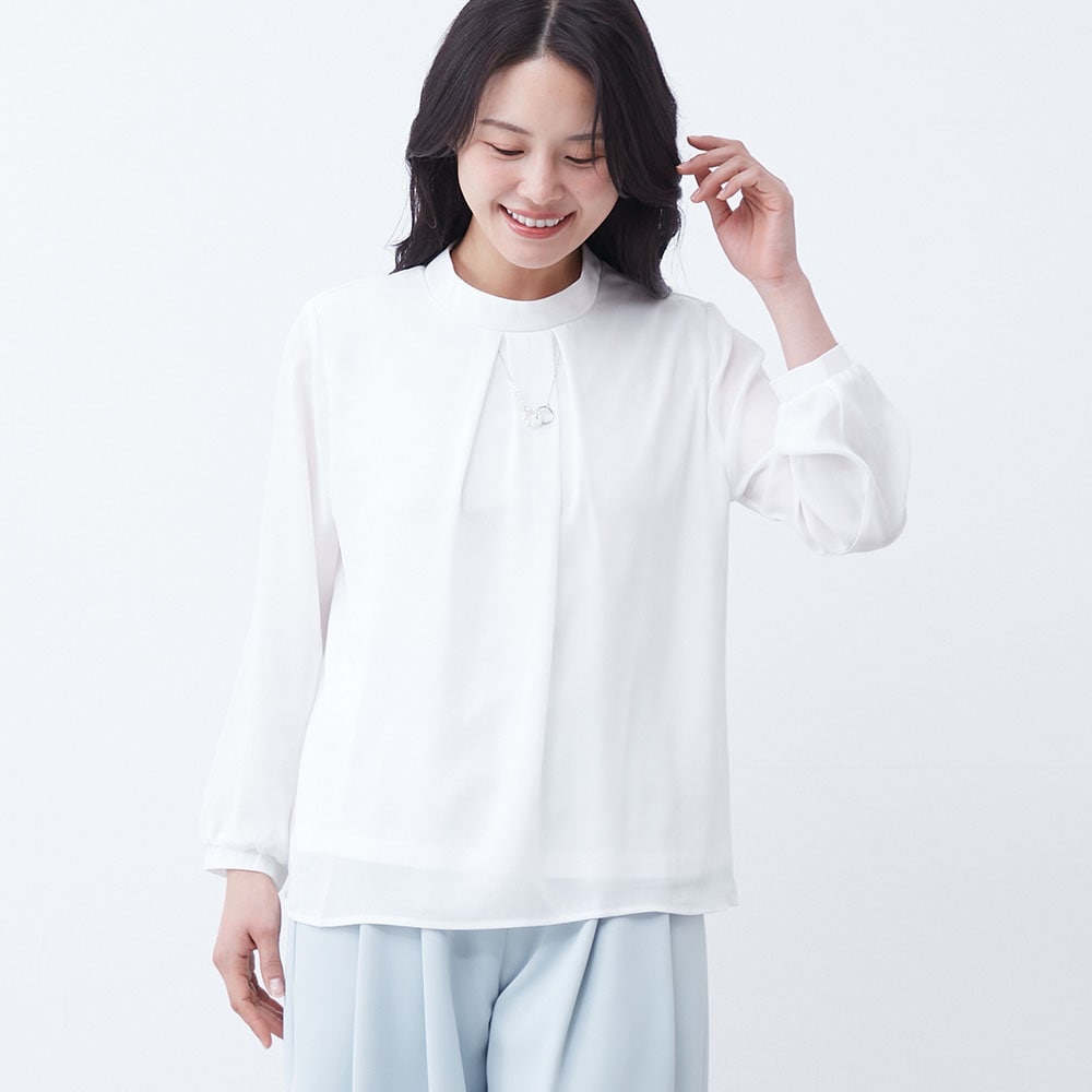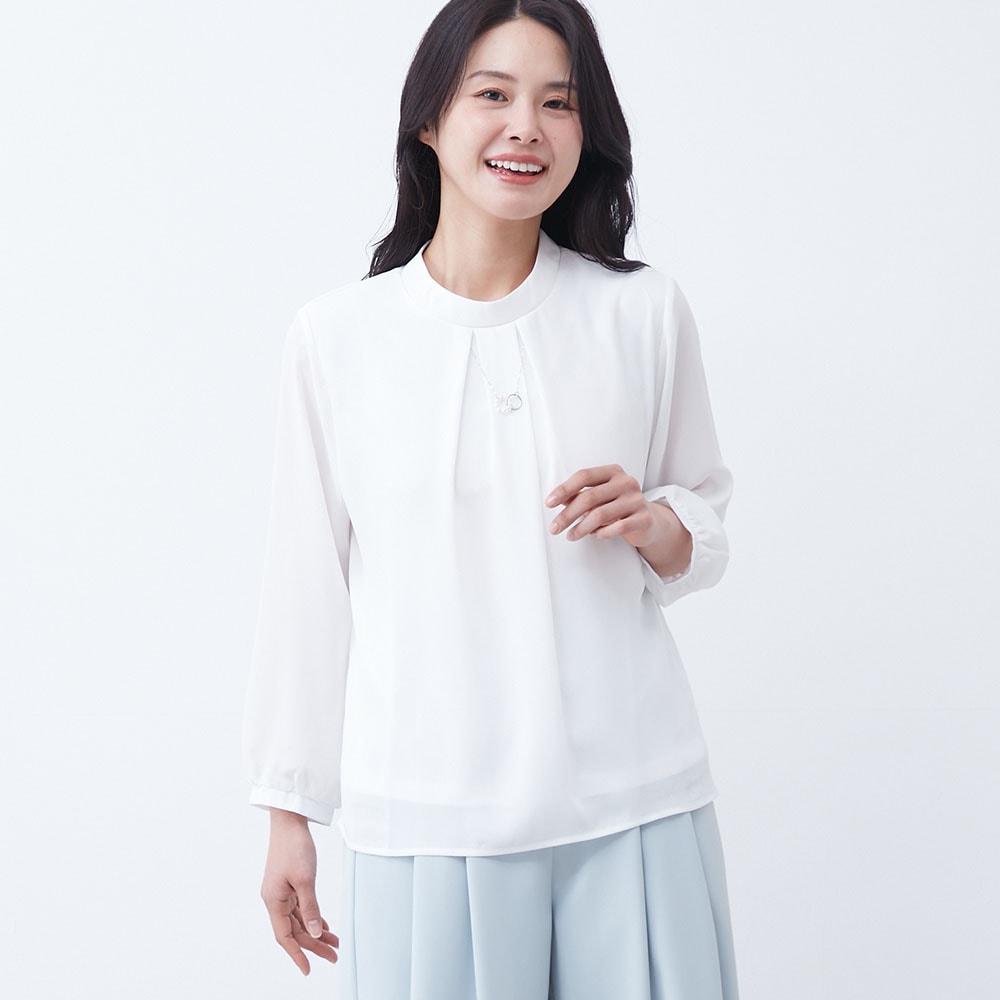 アクセ付きの華やかなプチハイネックブラウス
