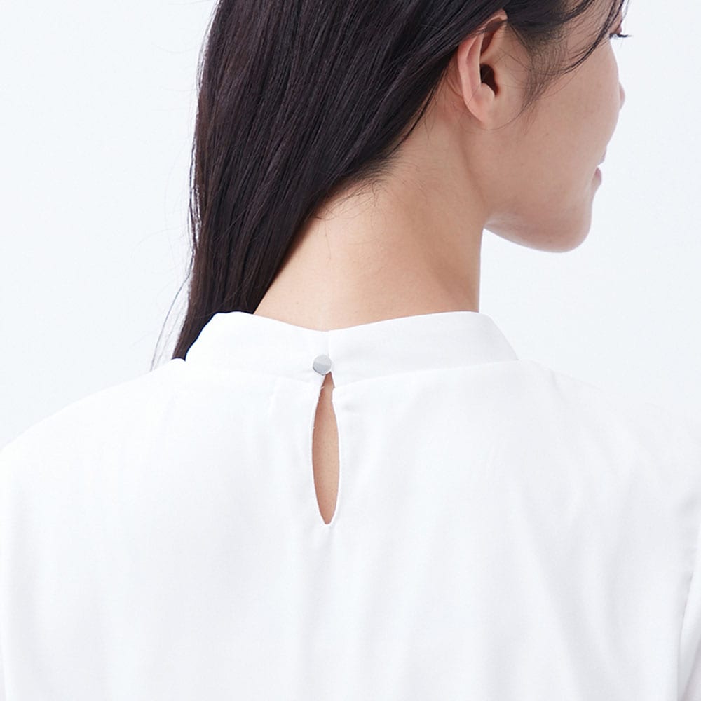 ・胸元のアクセとタックデザインが華やかなアクセント