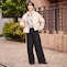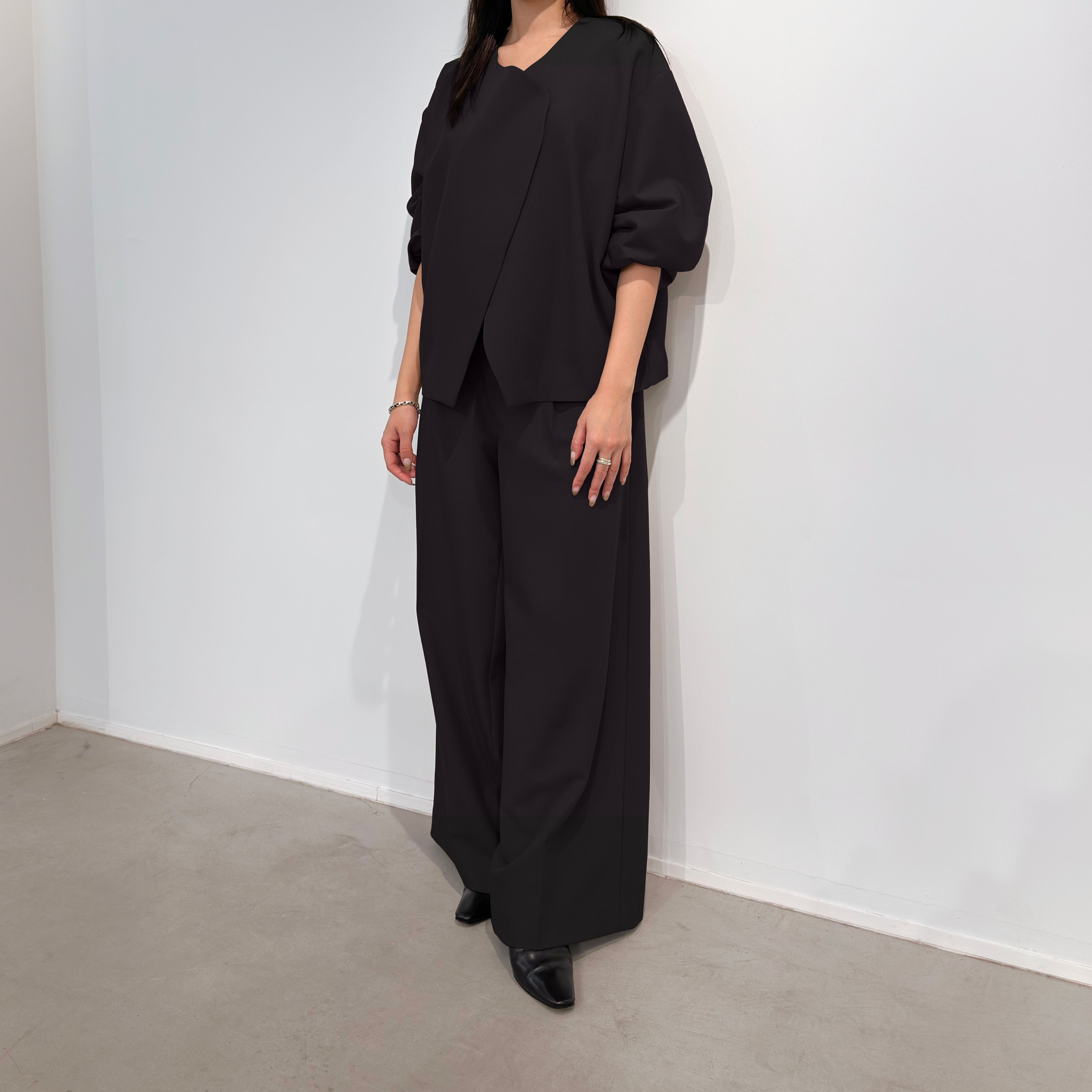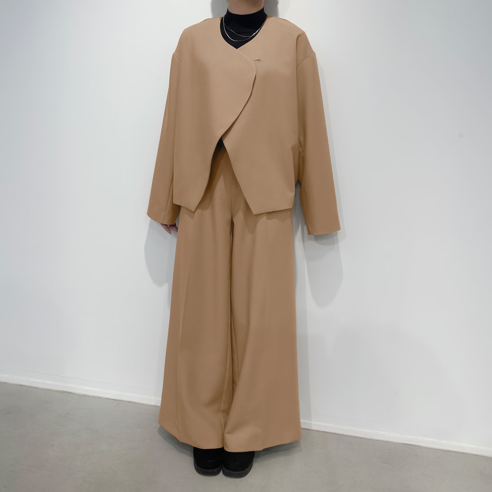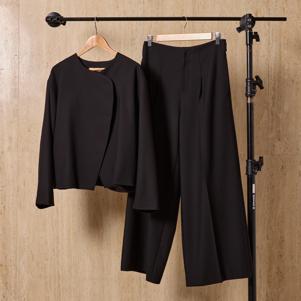 卒業式や冠婚葬祭のフォーマルにも着られるセットアップです。ジャケットは閉めても開けてもかっこいいです。