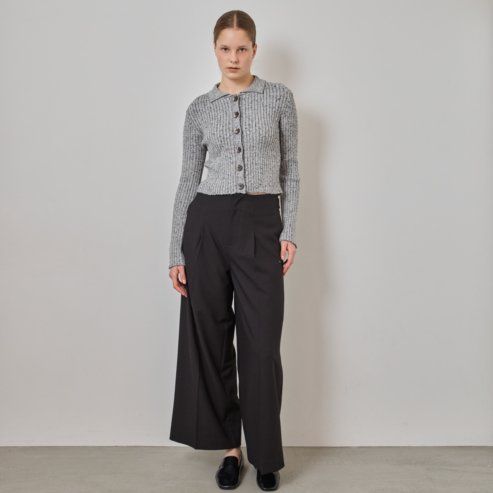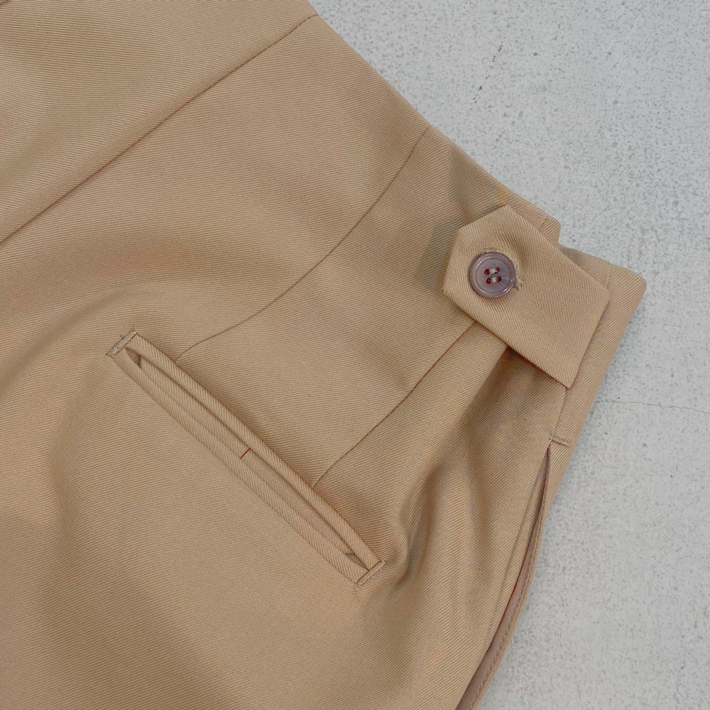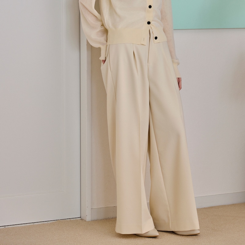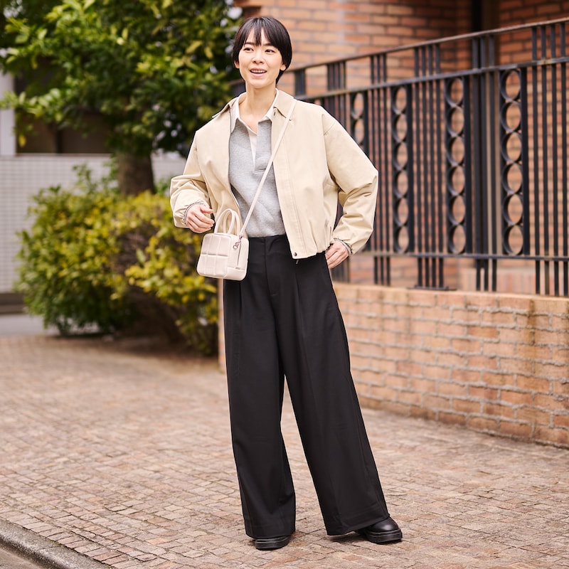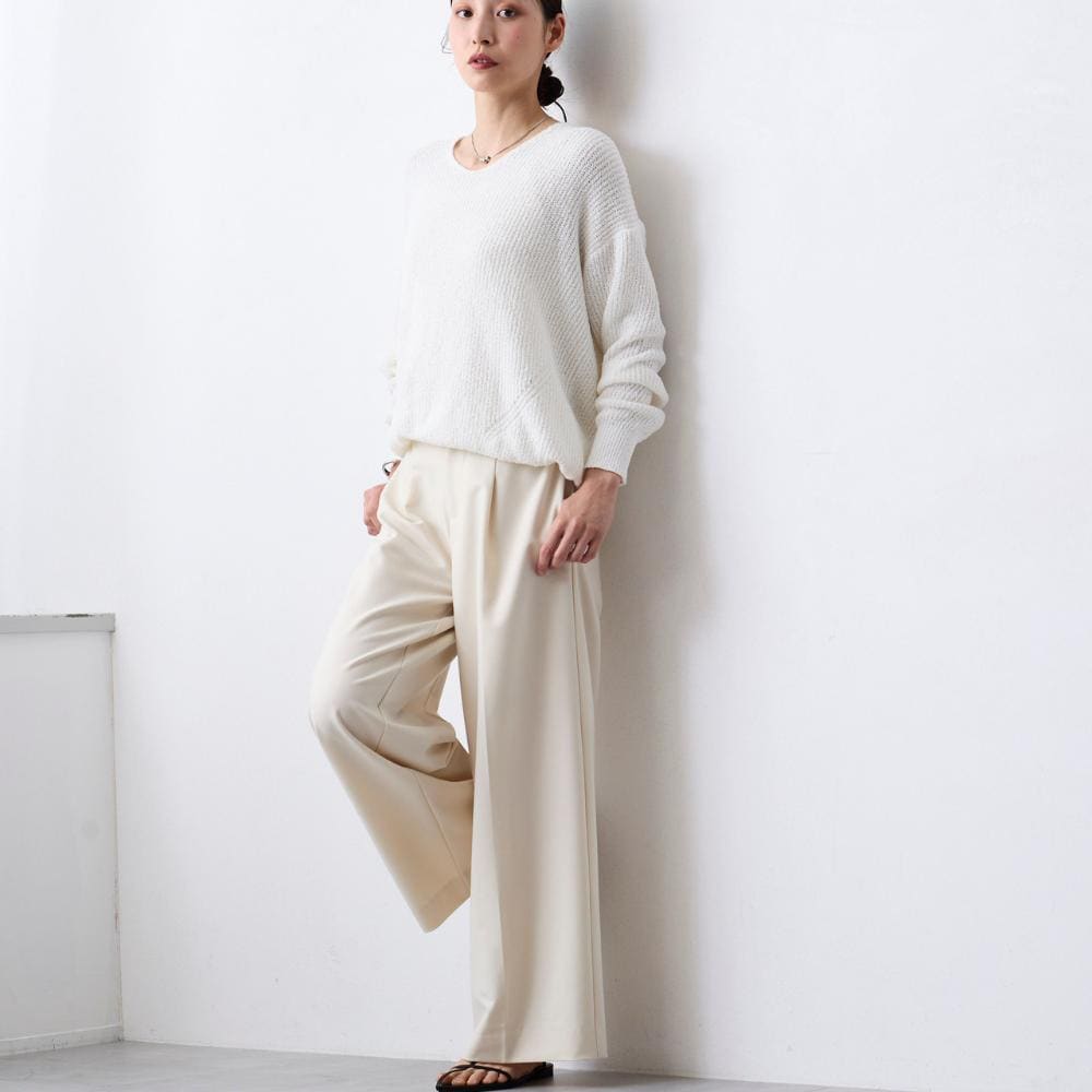 パンツ丈はヒール靴だとちょうどいいくらい。フラットソールでもギリギリいけます。足のラインがきれいに見えて、産後のちょっとぷっくりした体型でもすらっとした印象です。