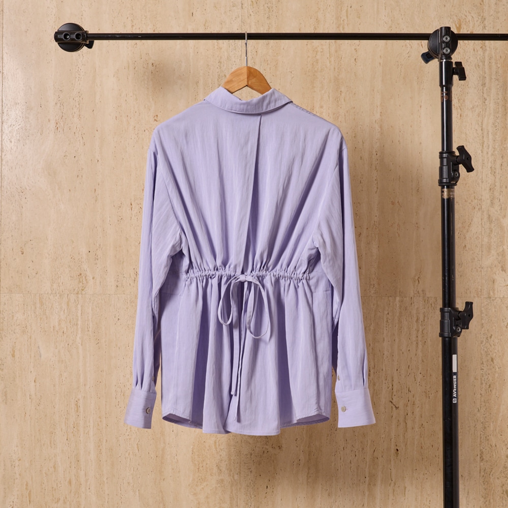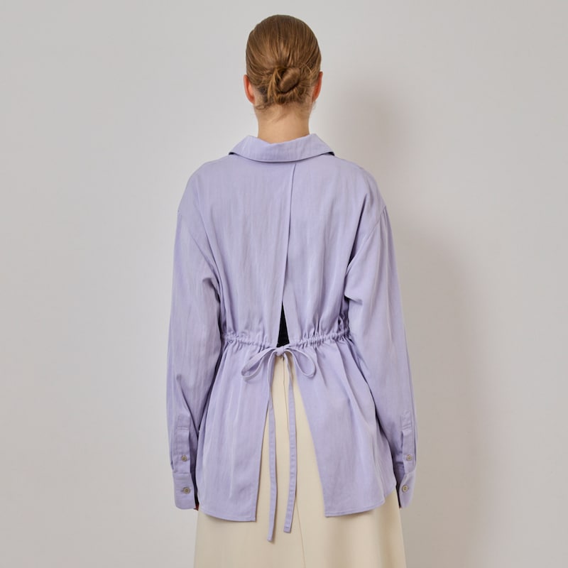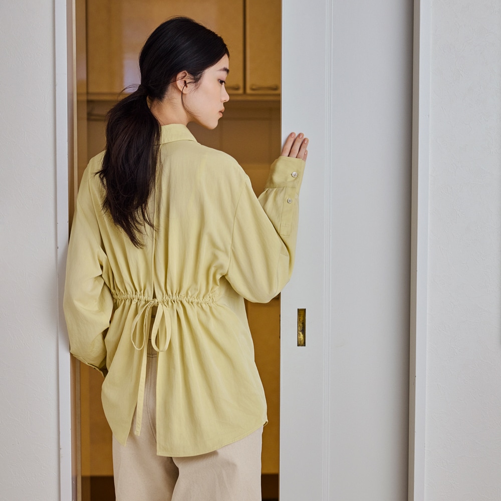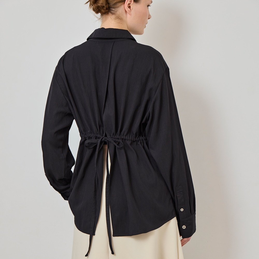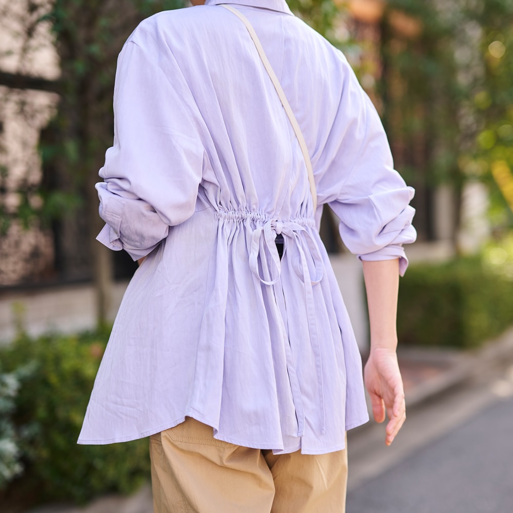 後ろのリボンがつくるギャザーで、シルエットに奥行きを。シャツにも羽織にも