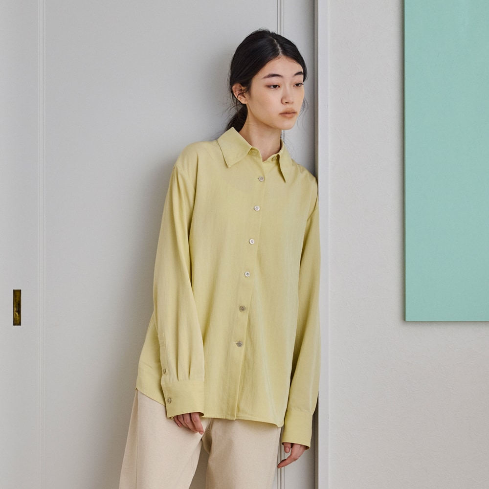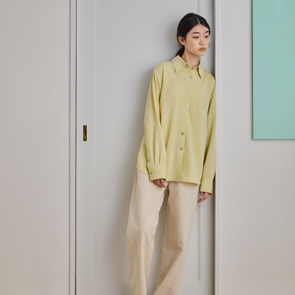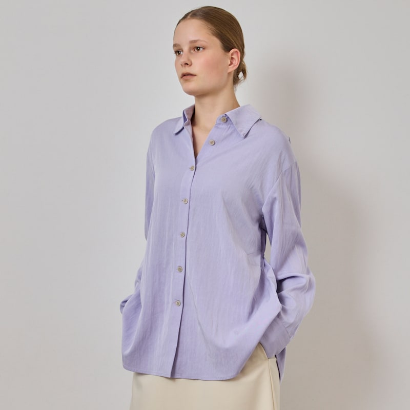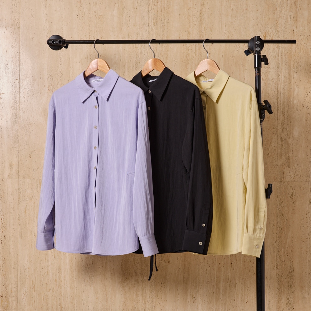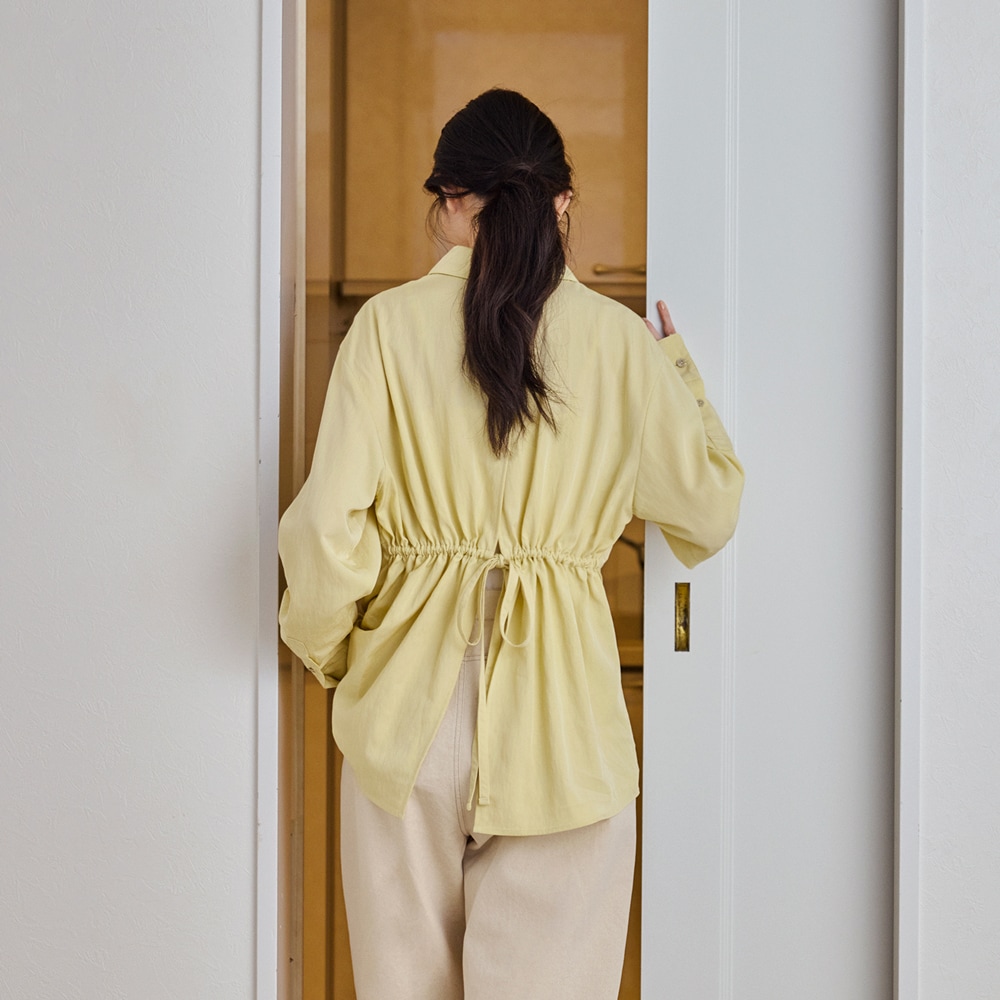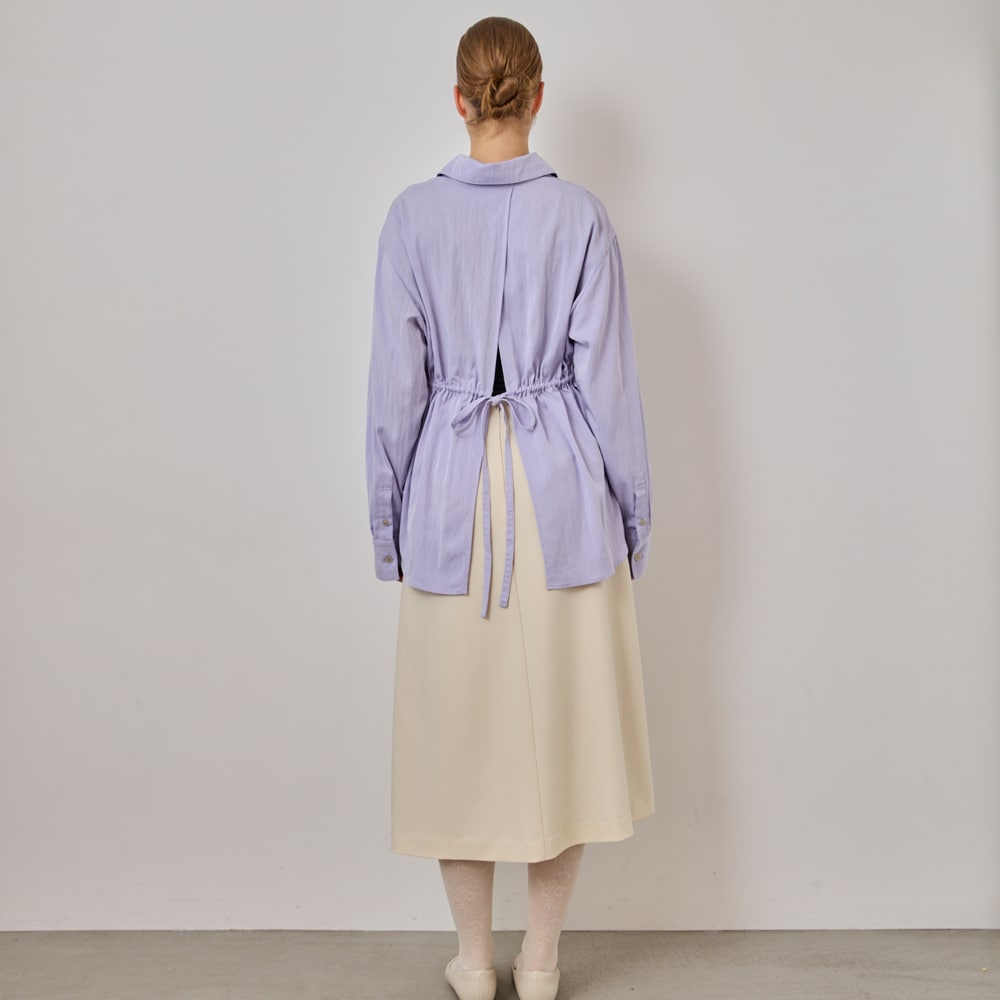 後ろのリボンがつくるギャザーで、シルエットに奥行きを。シャツにも羽織にも
