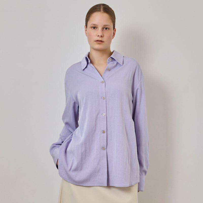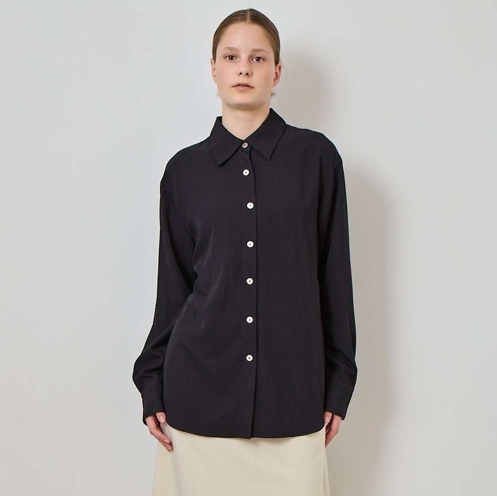 ・上品な光沢をまとったブラウス。カジュアルすぎず、大人の着こなしに馴染む一枚