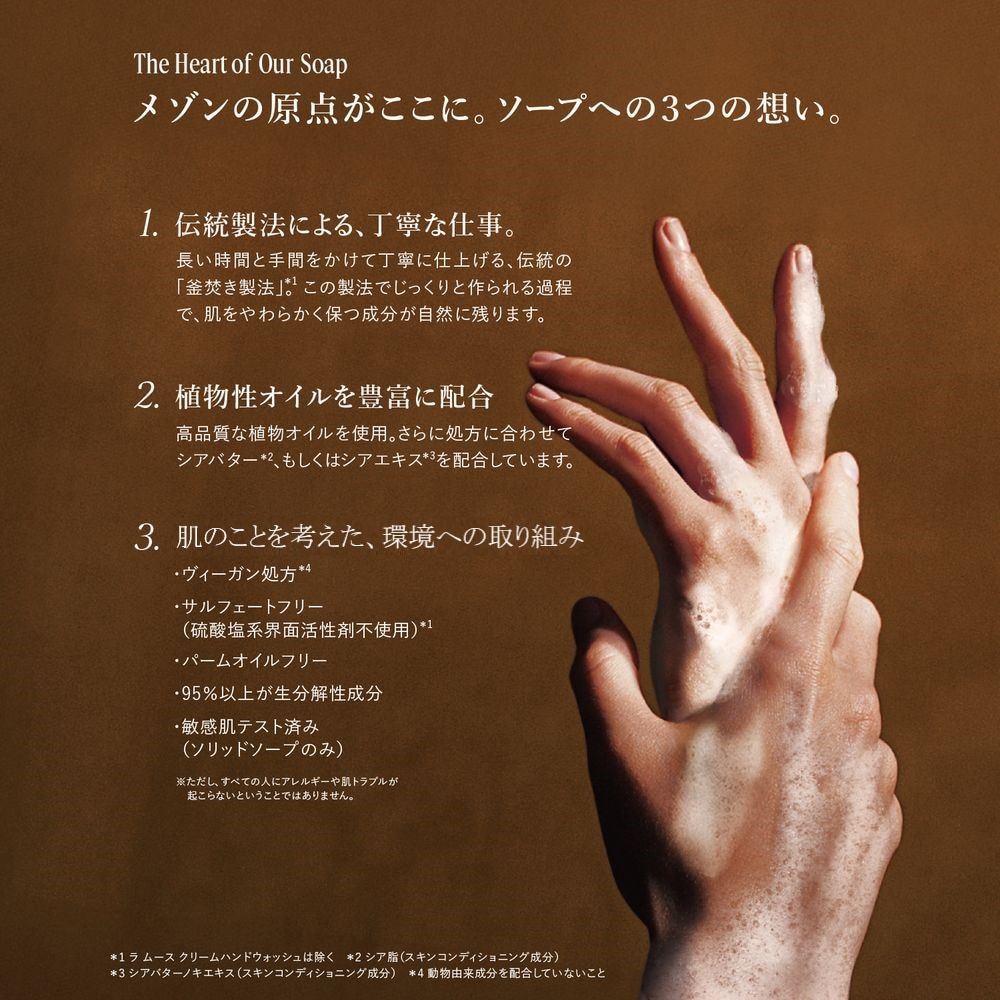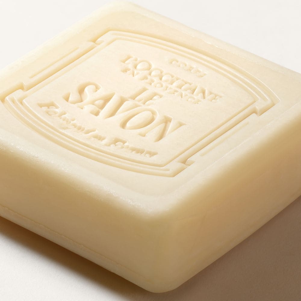 シアバター(*1)配合。窯焚き製法による、しっとりした洗い心地。ラベンダーとジャスミンが昼下がりの風のように満ちるソープ。