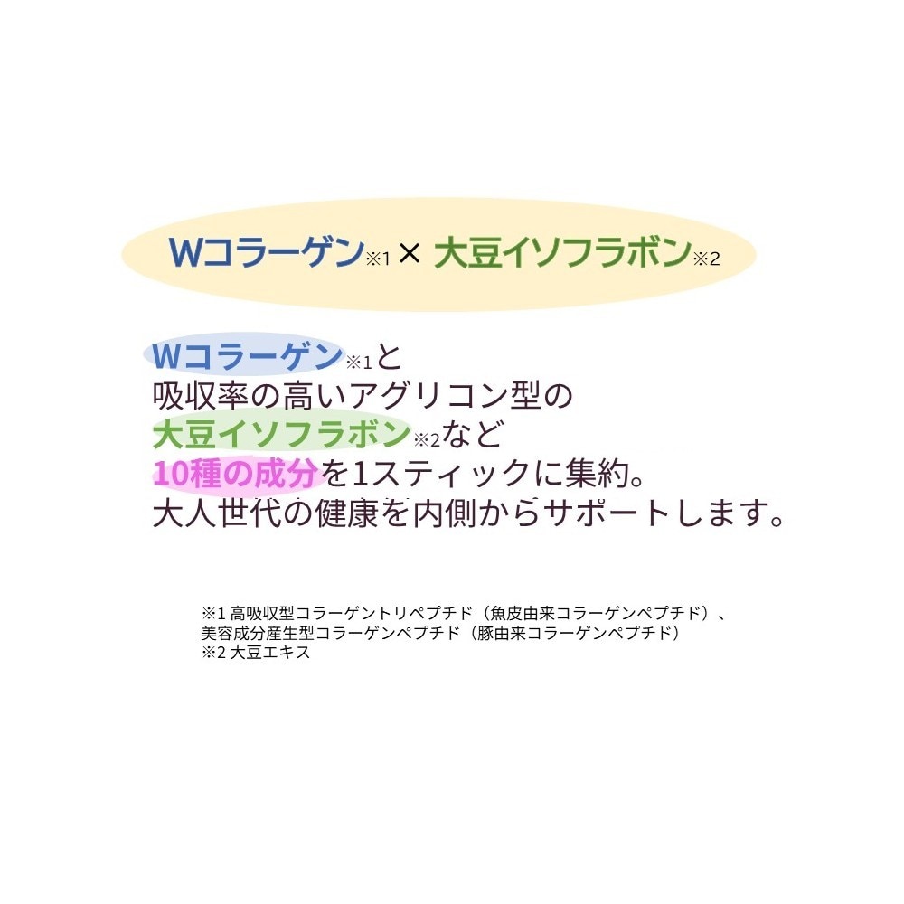 2種類のコラーゲン(※1)と大豆イソフラボン(※2)をはじめ、ビタミンC・ビタミンB1・ビタミンB6を配合したサプリメントです。