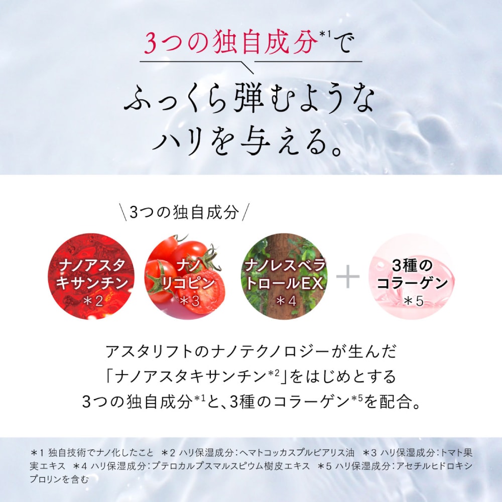 アスタリフト独自*2の「ナノアスタキサンチン*3」に加えて、厳選して配合した美容成分*4が肌に浸透*5。