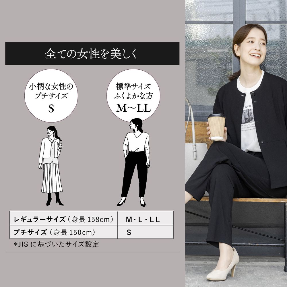 170cm3L体型でもLLサイズでピッタリで、お直し要らずでした!ワイドパンツでもストンとしてるので、カジュアルに見えたりもせず丁度よかったです。ジャケットは袖の長さが若干短めなので、インナーは長袖だと出てしまうかもしれない、といったところです。春秋用、冬は寒いかも。