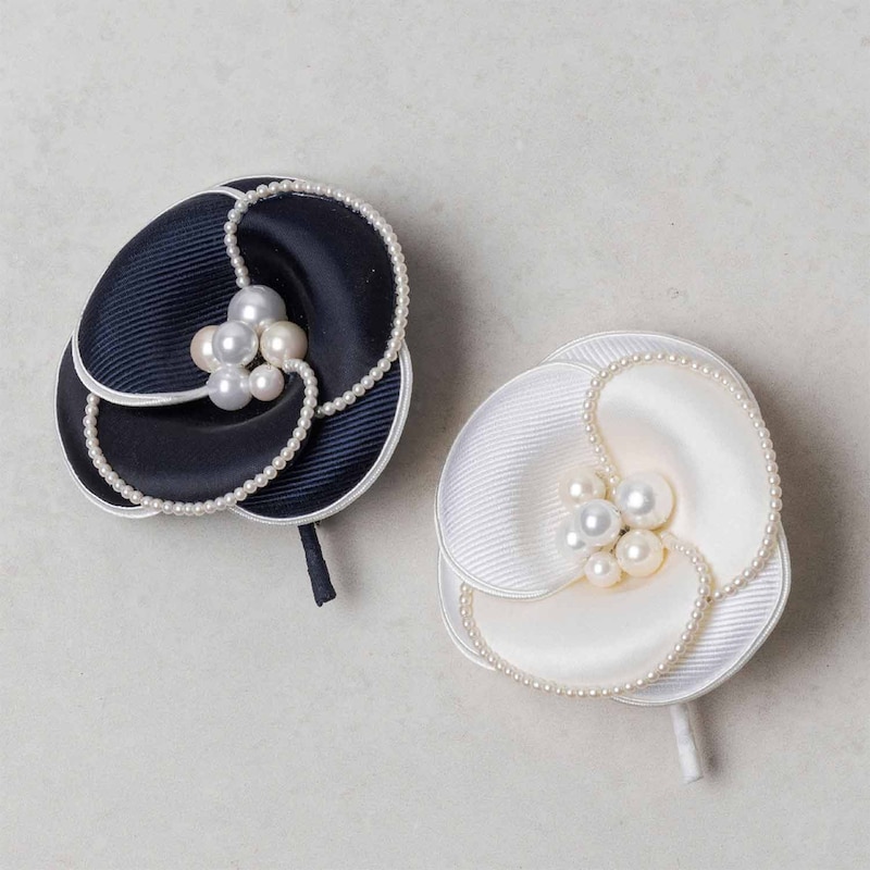 オフ、ネイビーは、花びらに光沢のあるグログラン素材とサテン素材の2種類を使用。