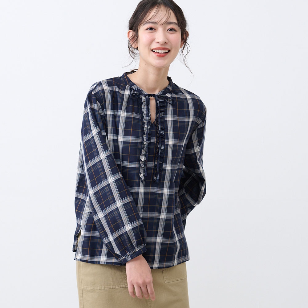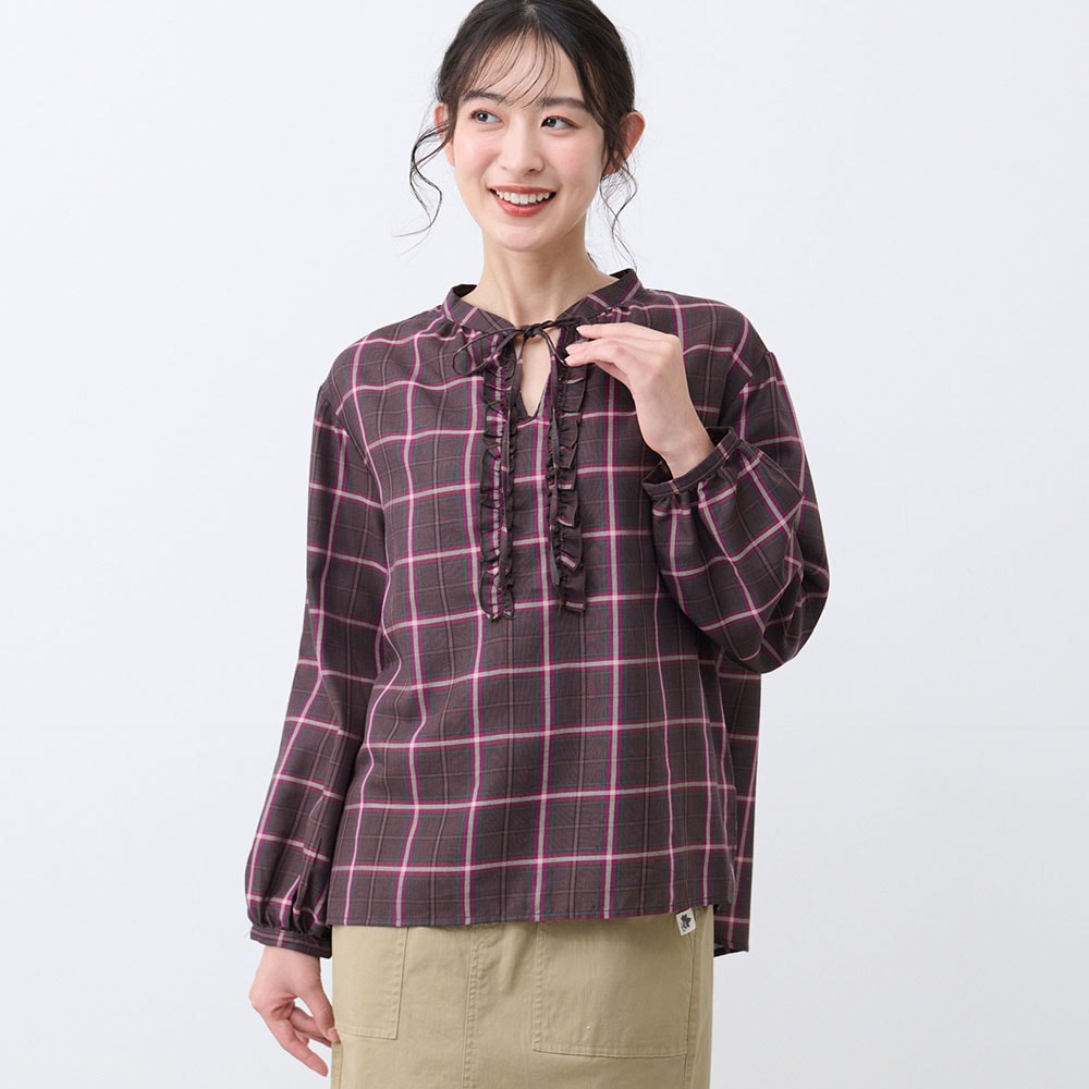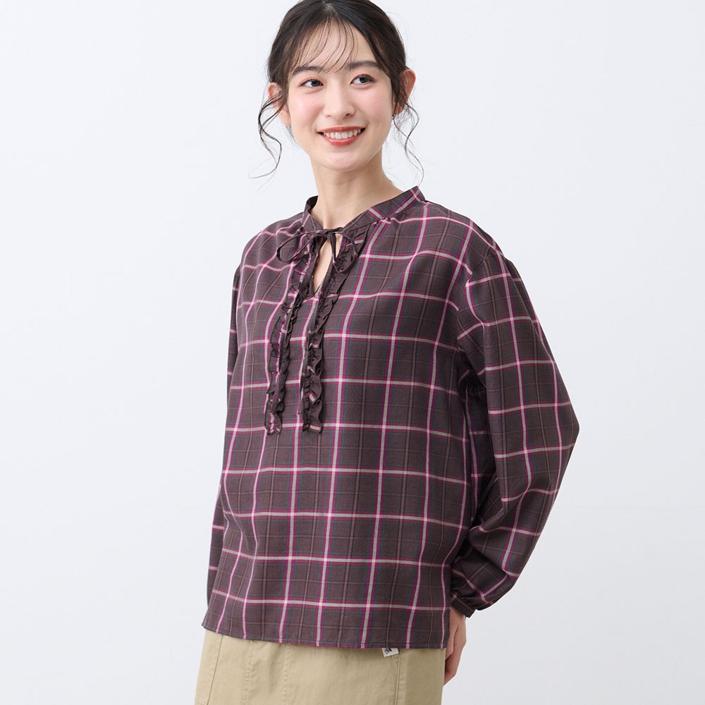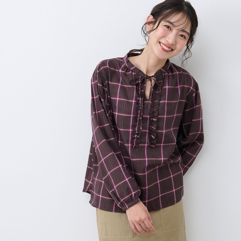 フロントのフリルとリボンが大人かわいい、チェック柄のふんわり袖ブラウス