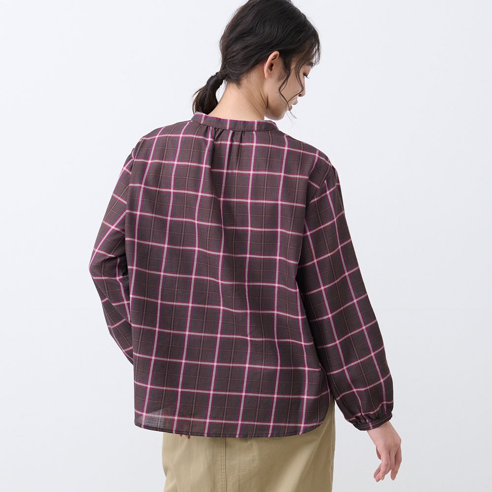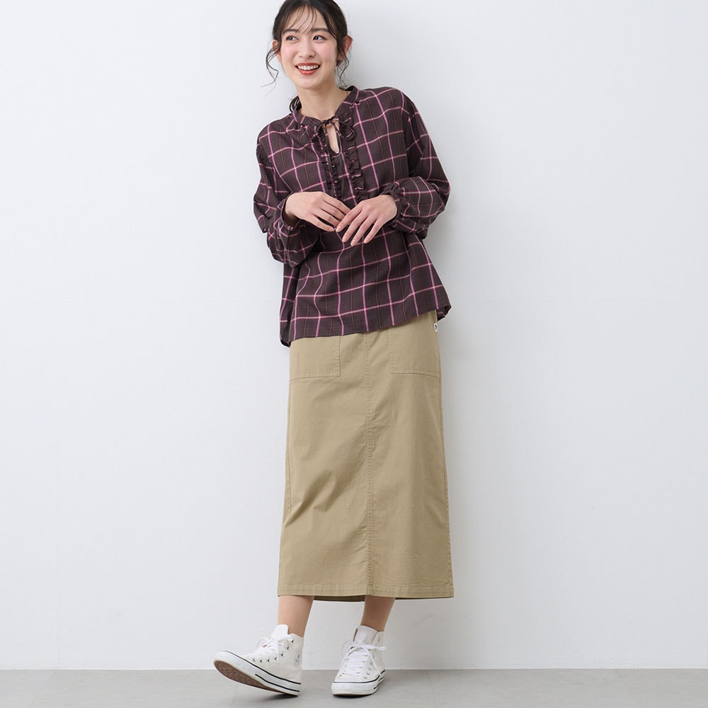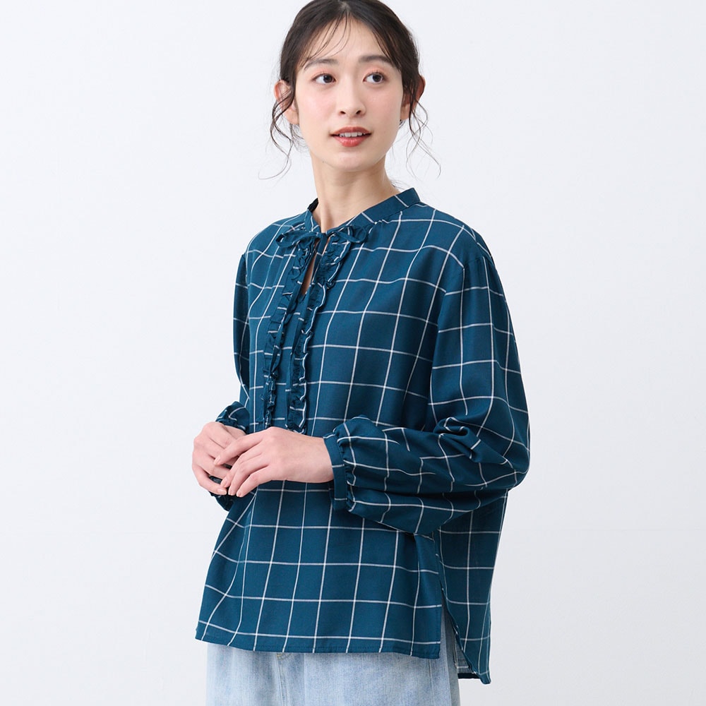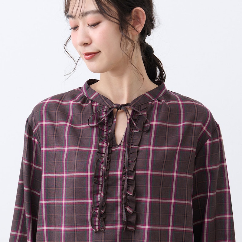 フロントのフリルとリボンが大人かわいい、チェック柄のふんわり袖ブラウス