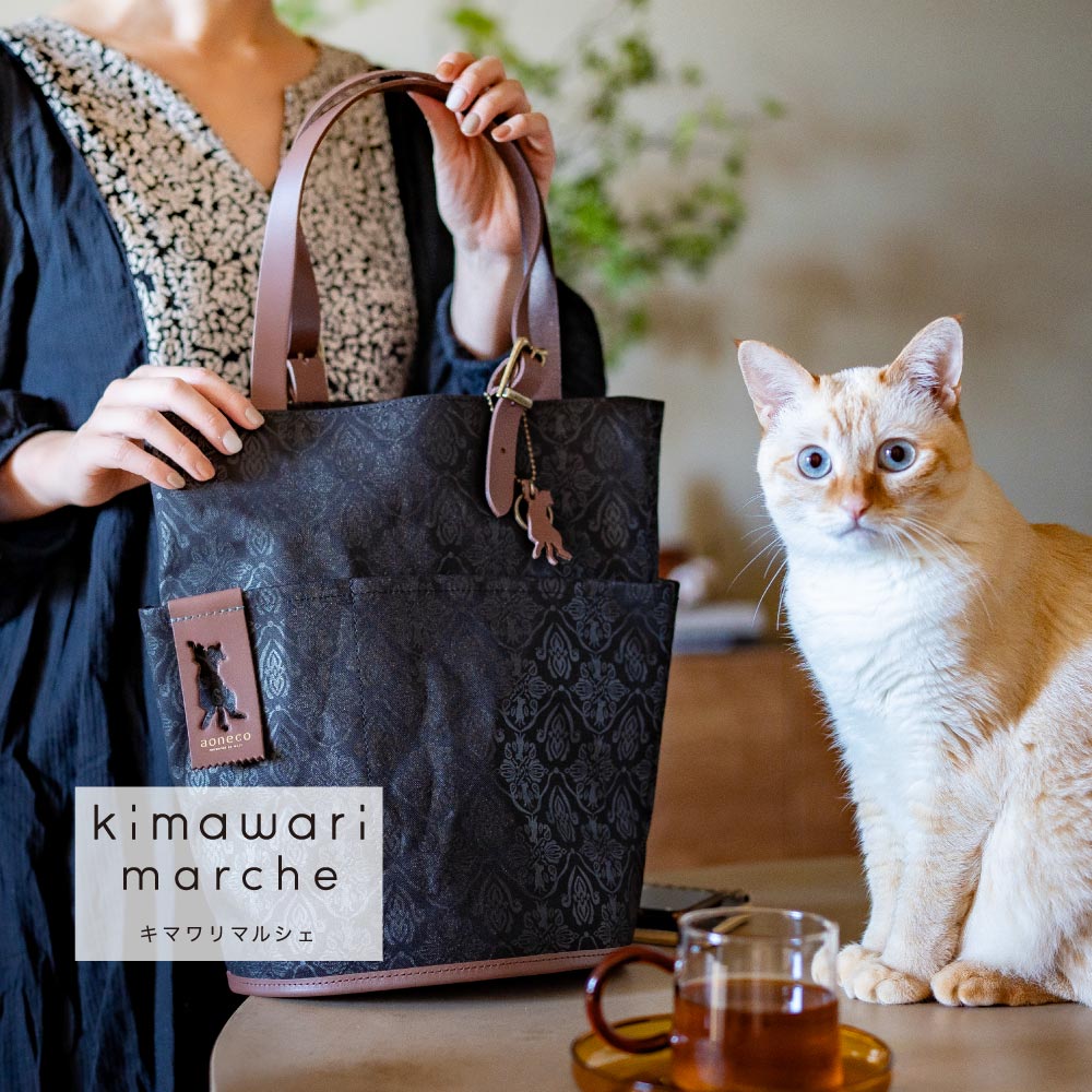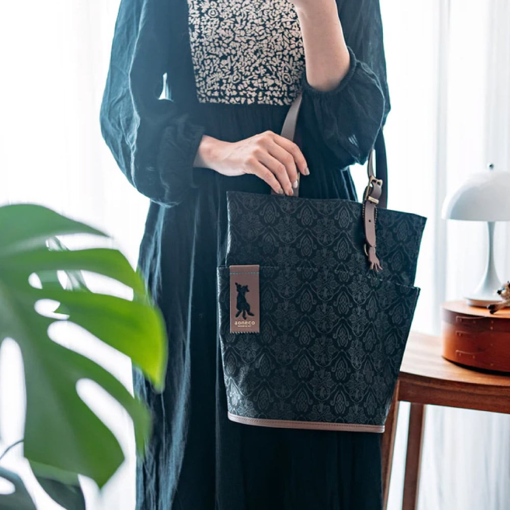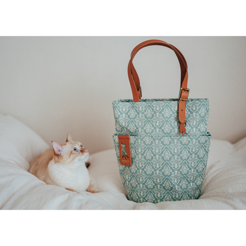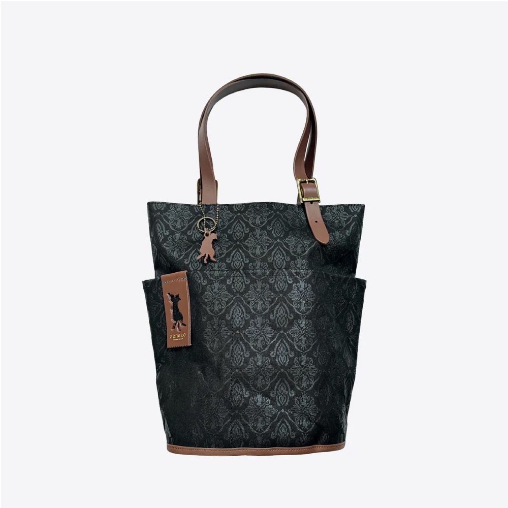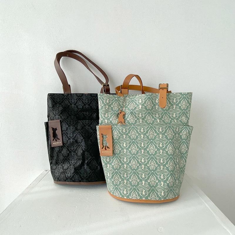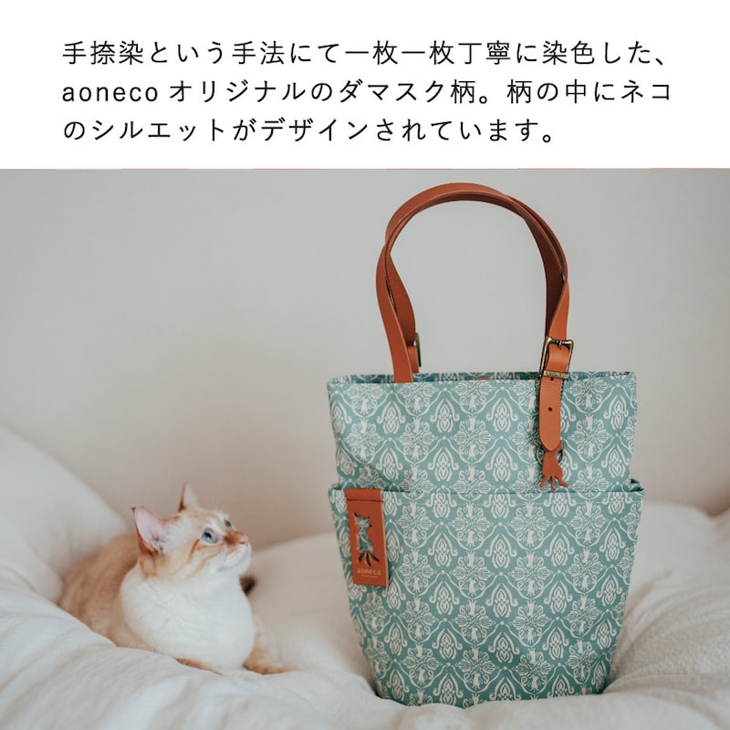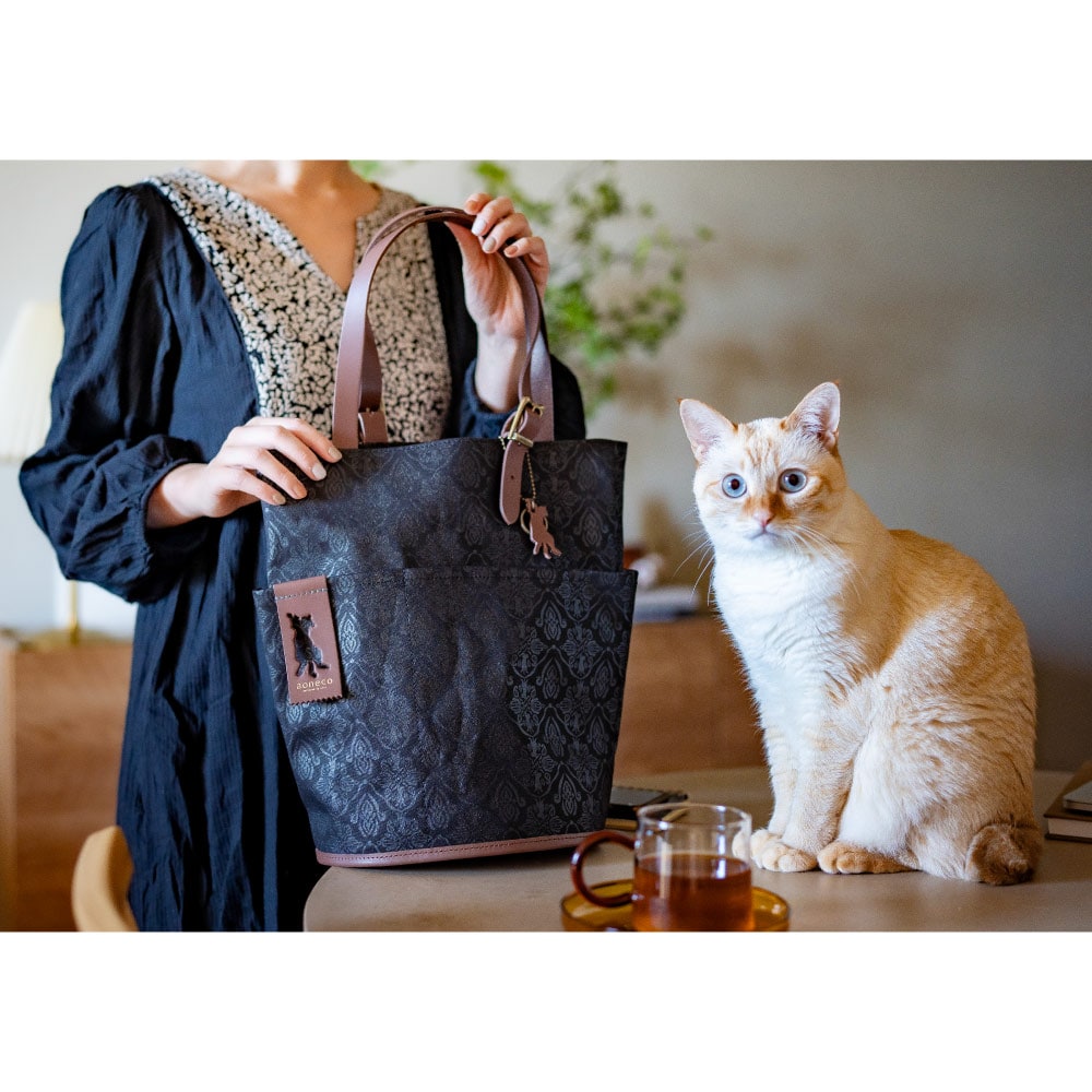 さりげなくネコ要素が満載の「aoneco(アオネコ)」のダマスクパターンのバケットトート。