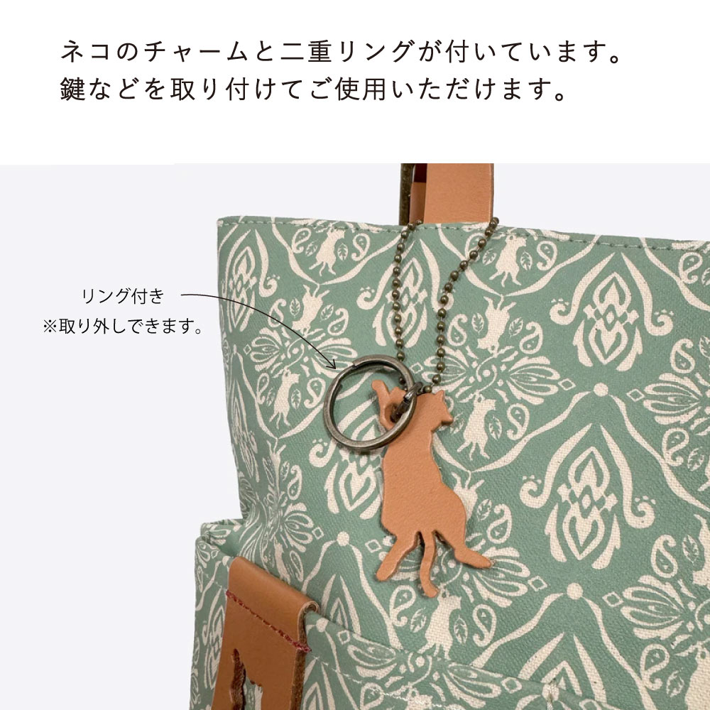 ●仰向けネコのチャームは取り外し可能。二重リング付きなので鍵や他のネコチャームも付けられます