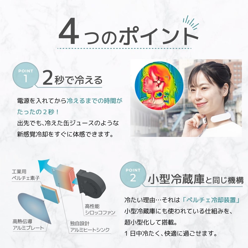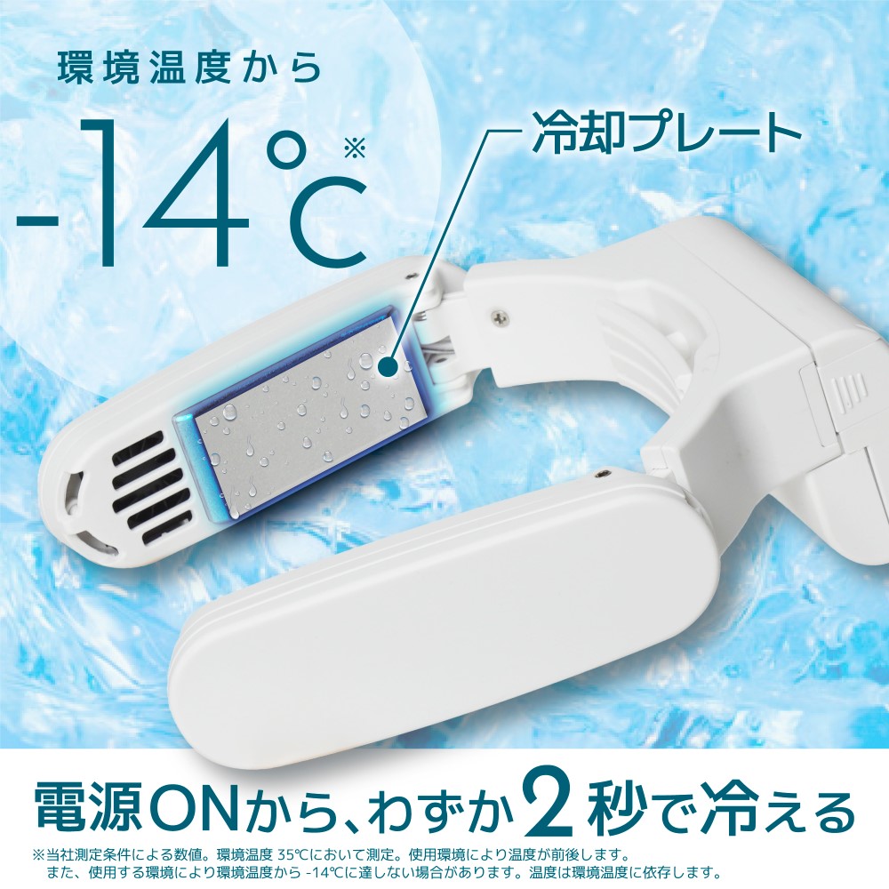 スイッチを入れてわずか2秒で冷却開始!冷えたプレートが直接肌に触れるため、静音ながらファンタイプより強い冷感を得られます。約180gの軽量設計で長時間装着でも肩への負担がかかりにくく、スマートな外観は外出先でも目立ちません。旅行先や、庭仕事など両手を使う作業中も、首に掛けるだけで「すぐひんやり」が叶います。