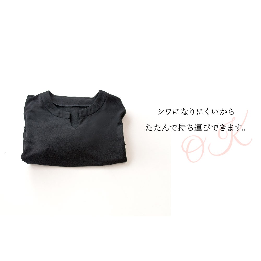 キーネックがデコルテラインを美しく見せてくれます。シワになりにくいから、たたんで持ち運べます。