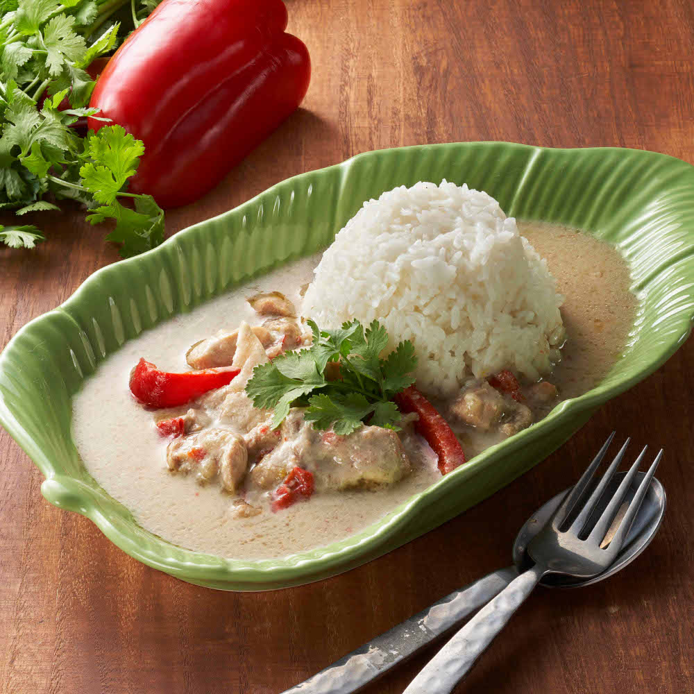青唐辛子のピリッとした辛さとレモングラスなどのハーブの風味、ココナッツミルクのコクで本格仕立て。タケノコ、パプリカで彩りと食感のアクセントも加えた、自慢のレシピです。みつせ鶏もも肉の旨みと、庄分酢の「かすみ黒酢」を入れることで、辛さの中にまろやかな酸味と甘みのある味わいに仕上がりました。