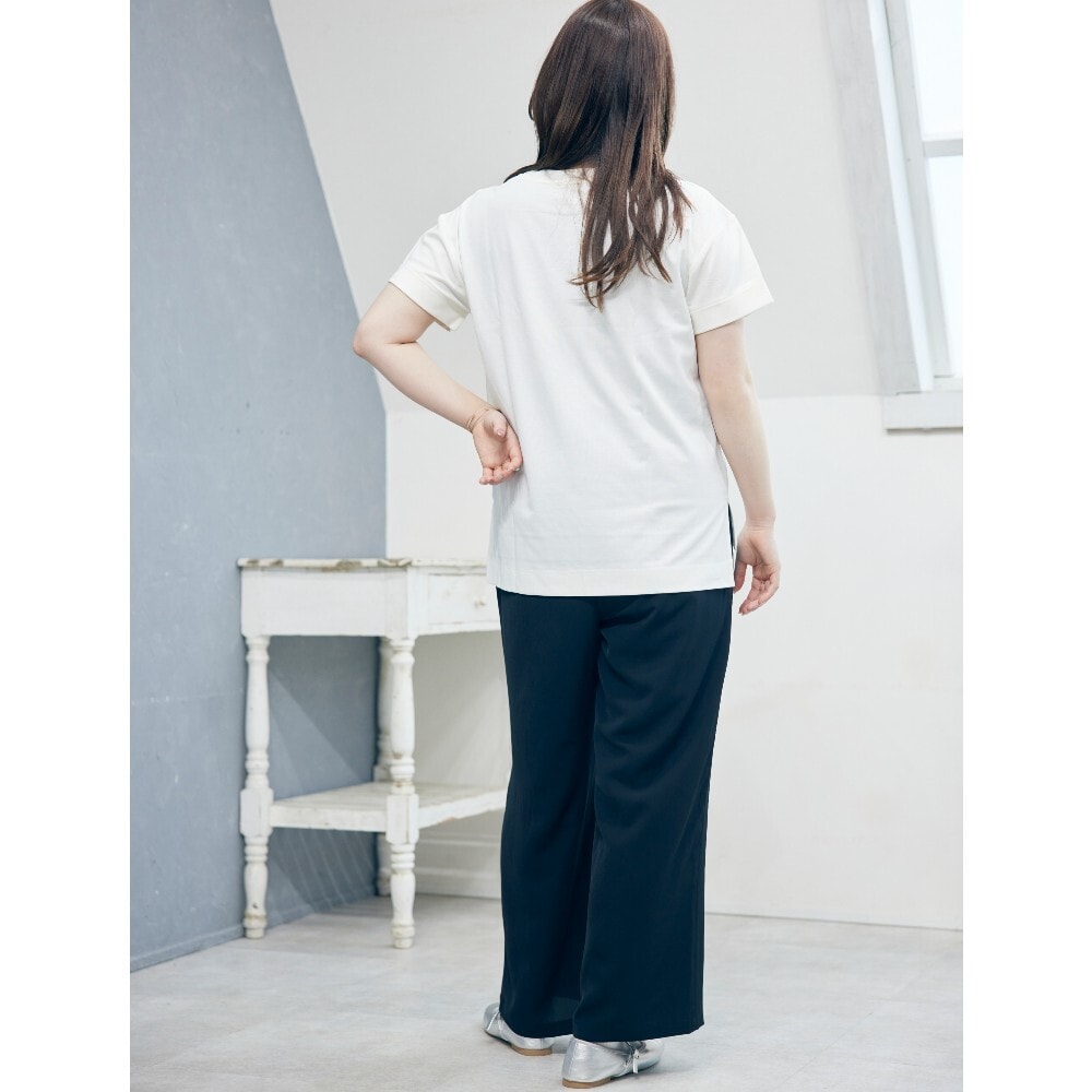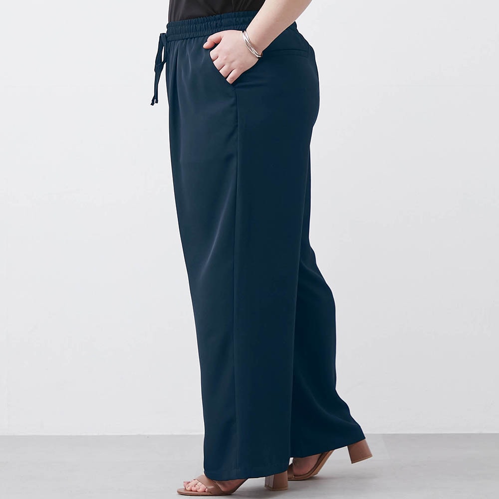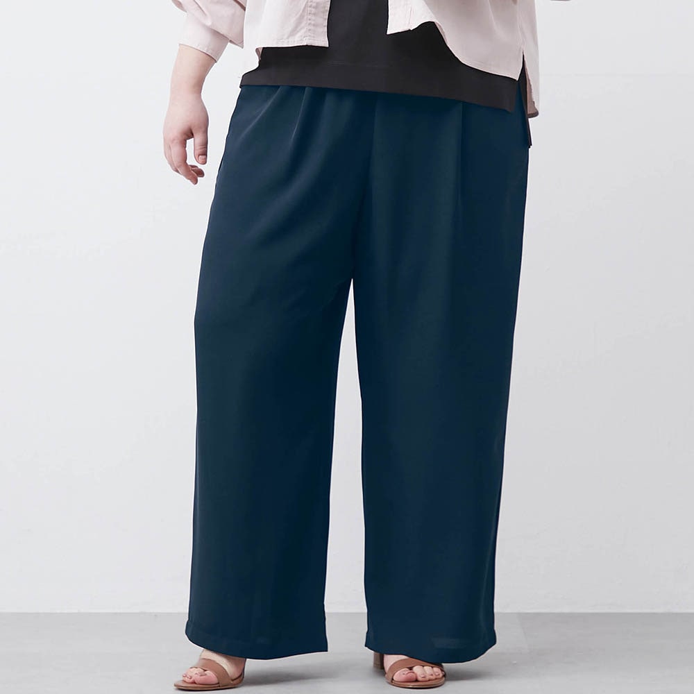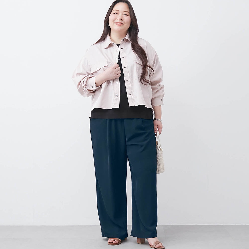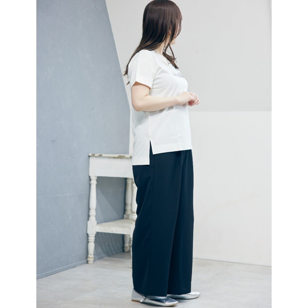 商品説明の情報量が少なめだったので不安がありましたが、インフルエンサーの方が着用している写真で判断し、購入してみました。結果良かった。骨ストぽっちゃりの私ですが、心配だった腰まわりの膨らみがあまり無くてわりとスッキリ見えます。生地はツルツルというかすべすべした感じ(写真ではわかりにくかった)。シワになりにくいと思います。