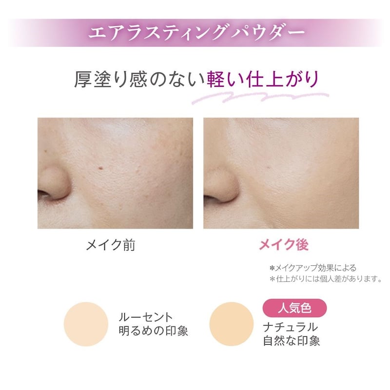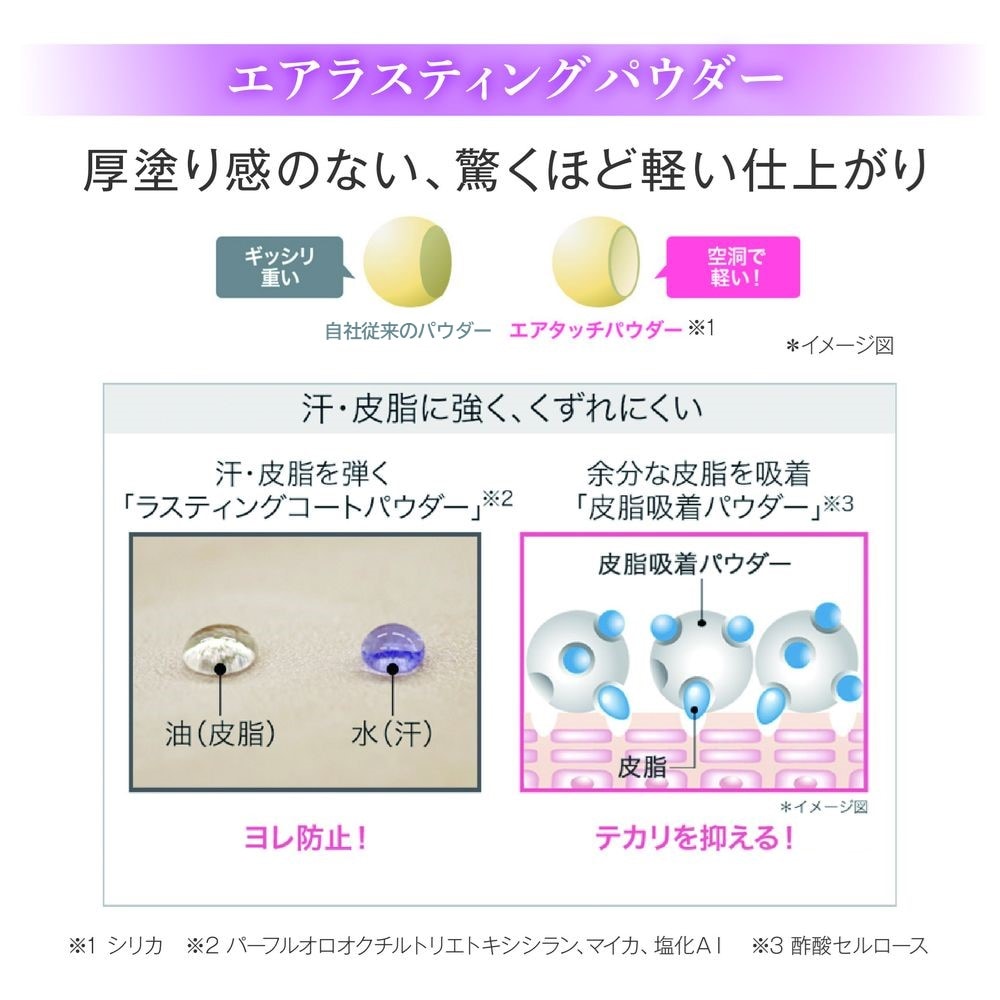 「エアラスティングパウダー」は、汗・皮脂を弾き、余分な皮脂を吸着する3種の「くずれ防止パウダー」を配合。