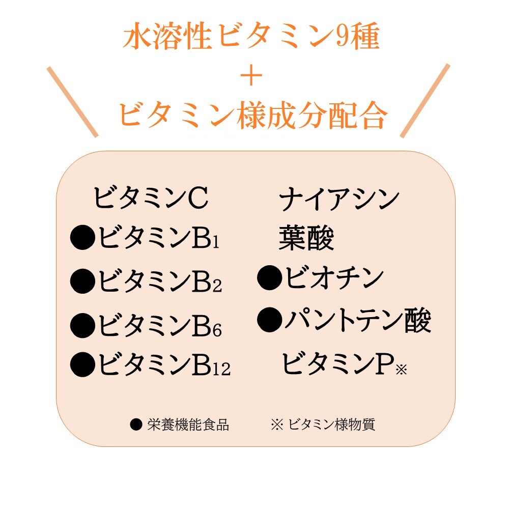 3000mgのビタミンCをはじめ、ビタミンB群などの水溶性ビタミン9種+ビタミン様成分を1スティックに集約。
