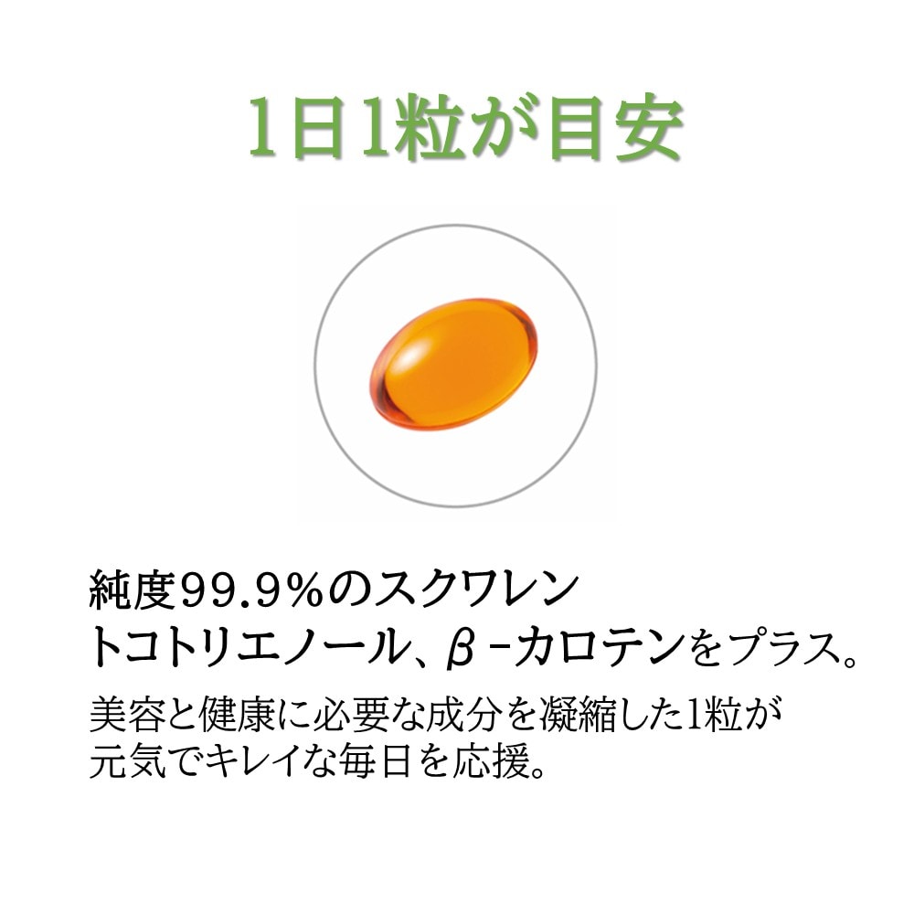 そのサメ肝油を高純度に精製したスクワレンに、美しさと元気を応援するトコトリエノール、β-カロテンをプラスしカプセルにとじ込めました。